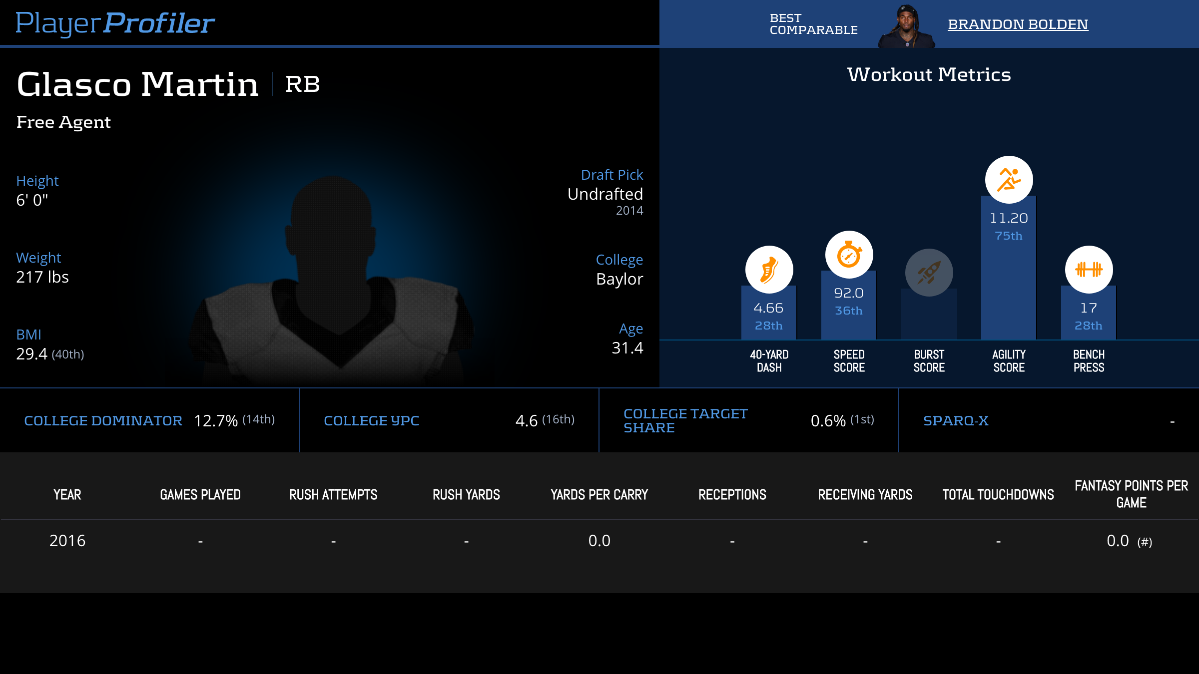 | Year Year | Games Games | Rush Attempts Rush Atts | Rushing Yards Rush Yrds | Total Touchdowns TDs | Receptions Rec | Receiving Yards Rec Yrds | Target Share Tgt Share | Age Age | School School |