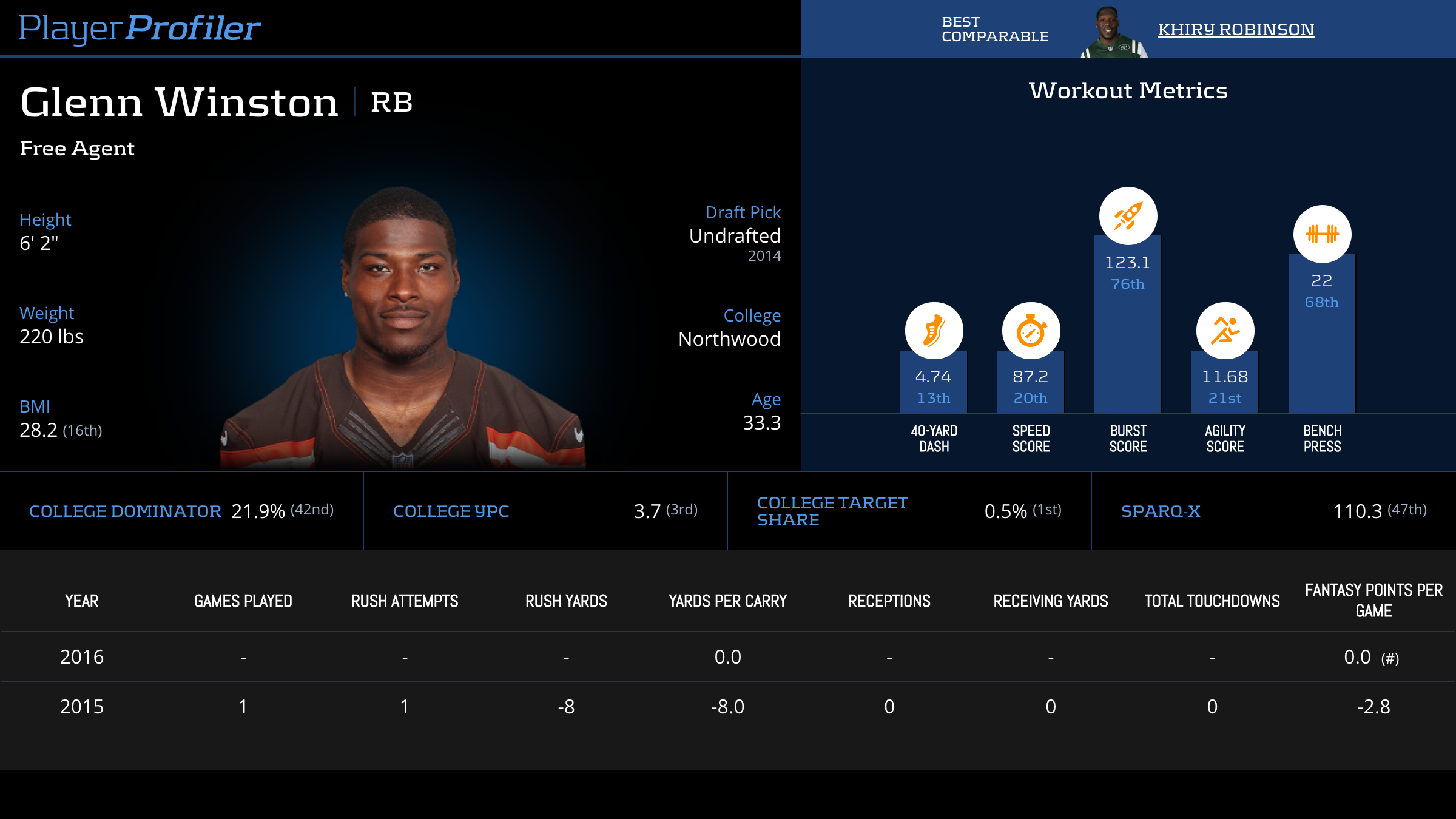 | Year Year | Games Games | Rush Attempts Rush Atts | Rushing Yards Rush Yrds | Total Touchdowns TDs | Receptions Rec | Receiving Yards Rec Yrds | Target Share Tgt Share | Age Age | School School |