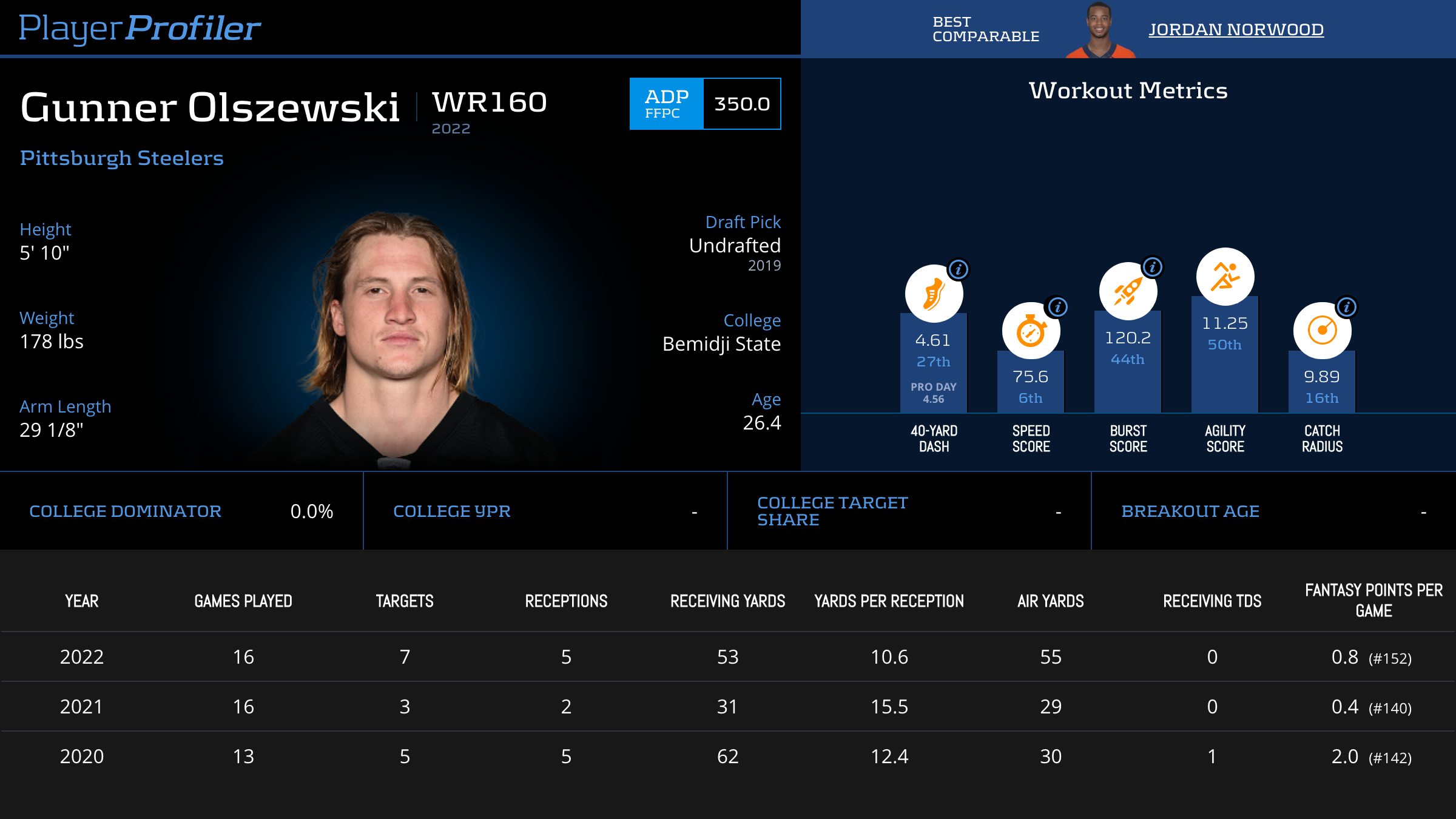 | 13 | NE | Marcus Jones | 1.8% | 1 (3.9% rate) | -- | -- | -- | -2.0 (#157) |