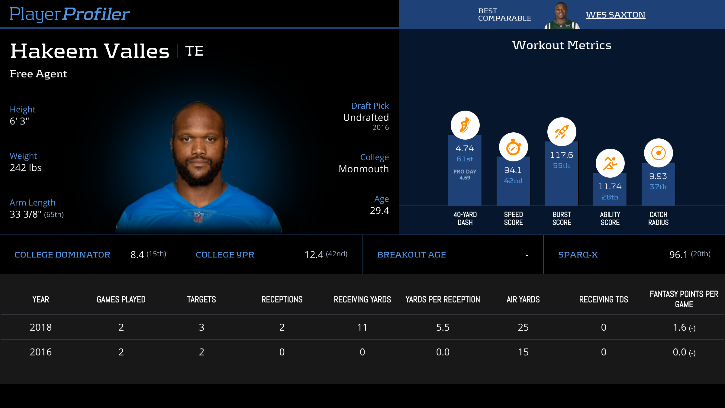 | Year Year | Games Games | Receptions Recs | Receiving Yards Rec Yds | Target Share Tgt Share | Catch Rate Catch Rate | Receiving Touchdowns Rec TDs | Special Teams Yards Special Teams | Age Age | School School |