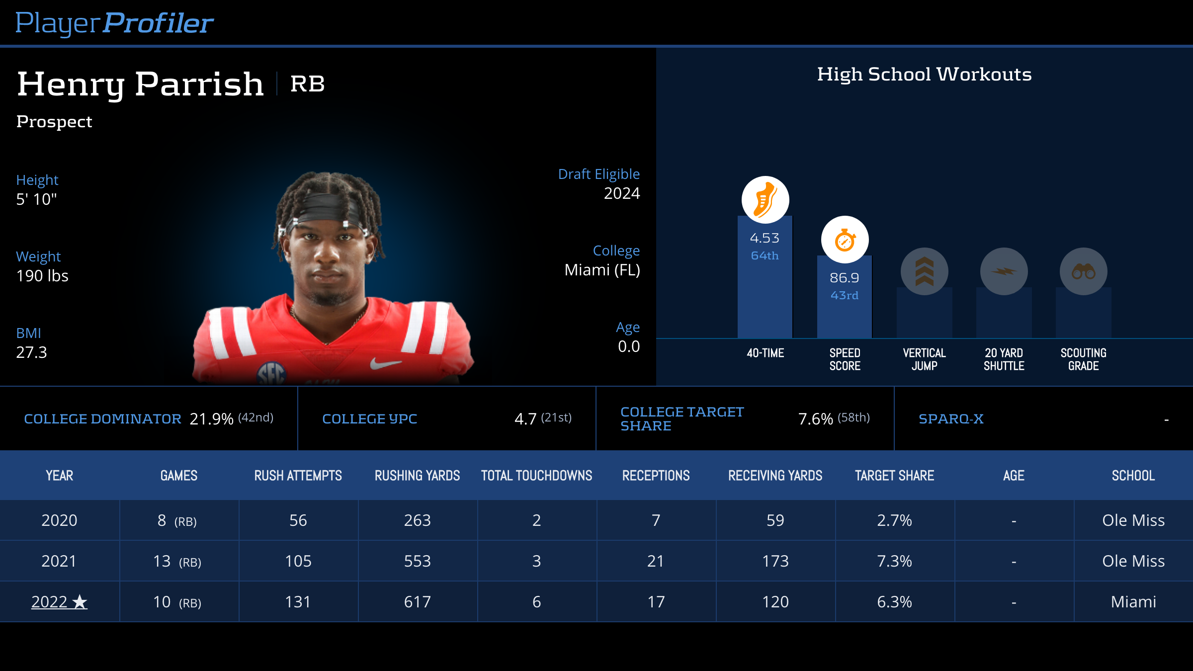 | Year Year | Games Games | Rush Attempts Rush Atts | Rushing Yards Rush Yrds | Total Touchdowns TDs | Receptions Rec | Receiving Yards Rec Yrds | Target Share Tgt Share | Age Age | School School |