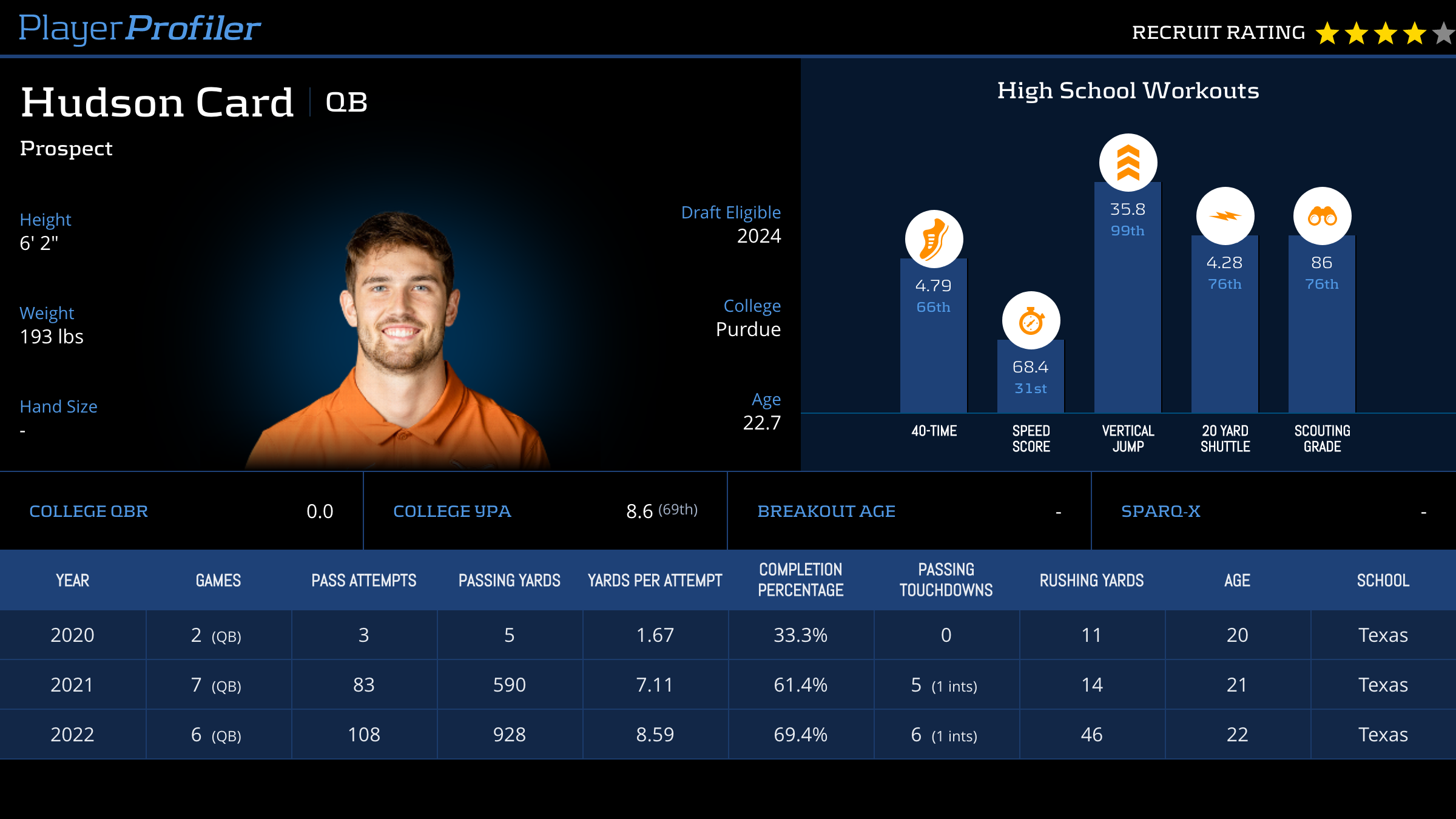 | Year Year | Games Games | Pass Attempts Pass Atts | Passing Yards Pass Yds | Yards Per Attempt YPA | Completion Percentage Comp % | Passing Touchdowns Pass TDs | Rushing Yards Rush Yds | Age Age | School School |