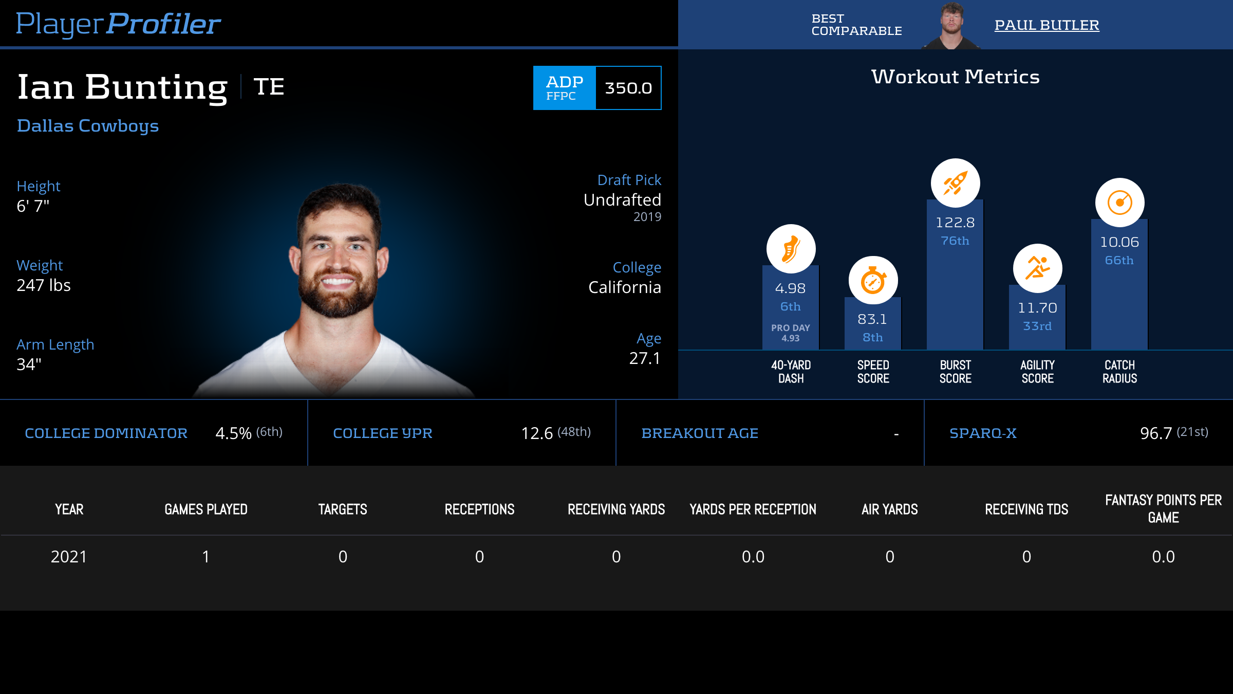 Box score statistics such as targets, yards, touchdowns, and fantasy points per target are updated the next day. Advanced stats and metrics are updated later in the week during the NFL season.