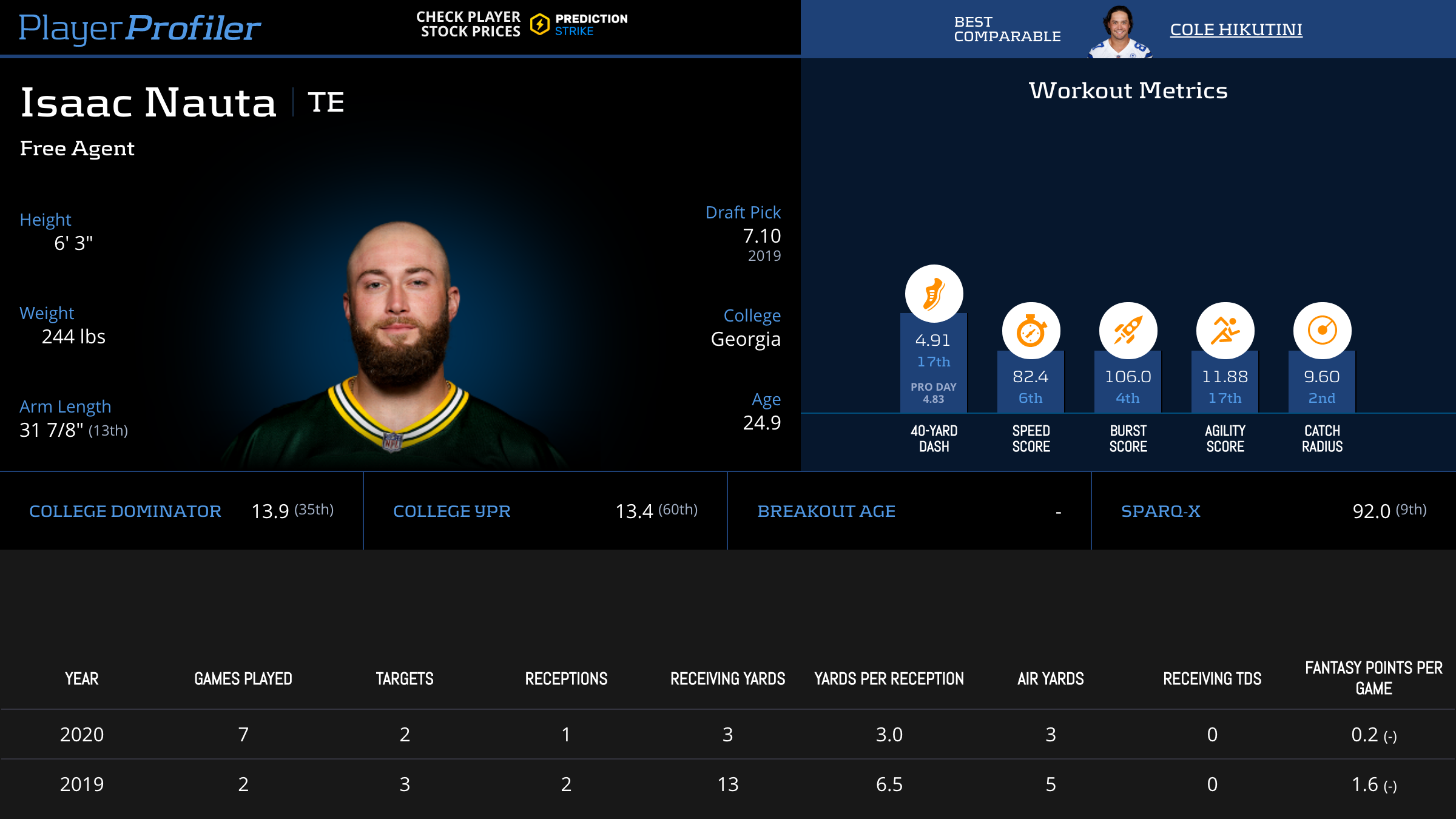 | Year Year | Games Games | Receptions Recs | Receiving Yards Rec Yds | Target Share Tgt Share | Catch Rate Catch Rate | Receiving Touchdowns Rec TDs | Special Teams Yards Special Teams | Age Age | School School |