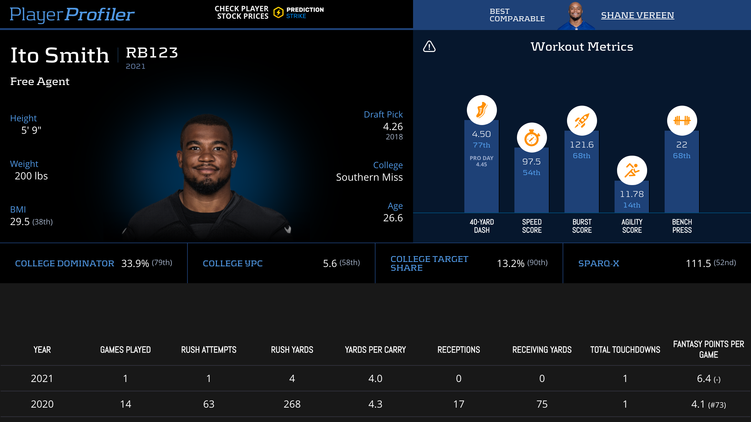 | Year Year | Games Games | Rush Attempts Rush Atts | Rushing Yards Rush Yrds | Total Touchdowns TDs | Receptions Rec | Receiving Yards Rec Yrds | Target Share Tgt Share | Age Age | School School |