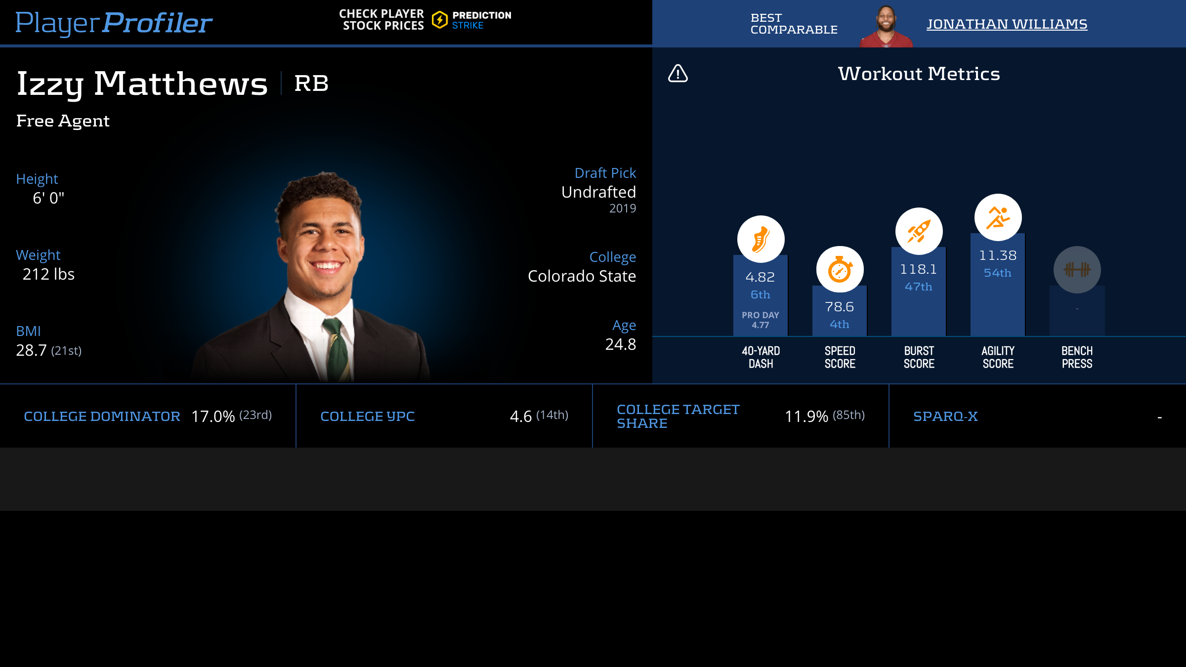 | Year Year | Games Games | Rush Attempts Rush Atts | Rushing Yards Rush Yrds | Total Touchdowns TDs | Receptions Rec | Receiving Yards Rec Yrds | Target Share Tgt Share | Age Age | School School |