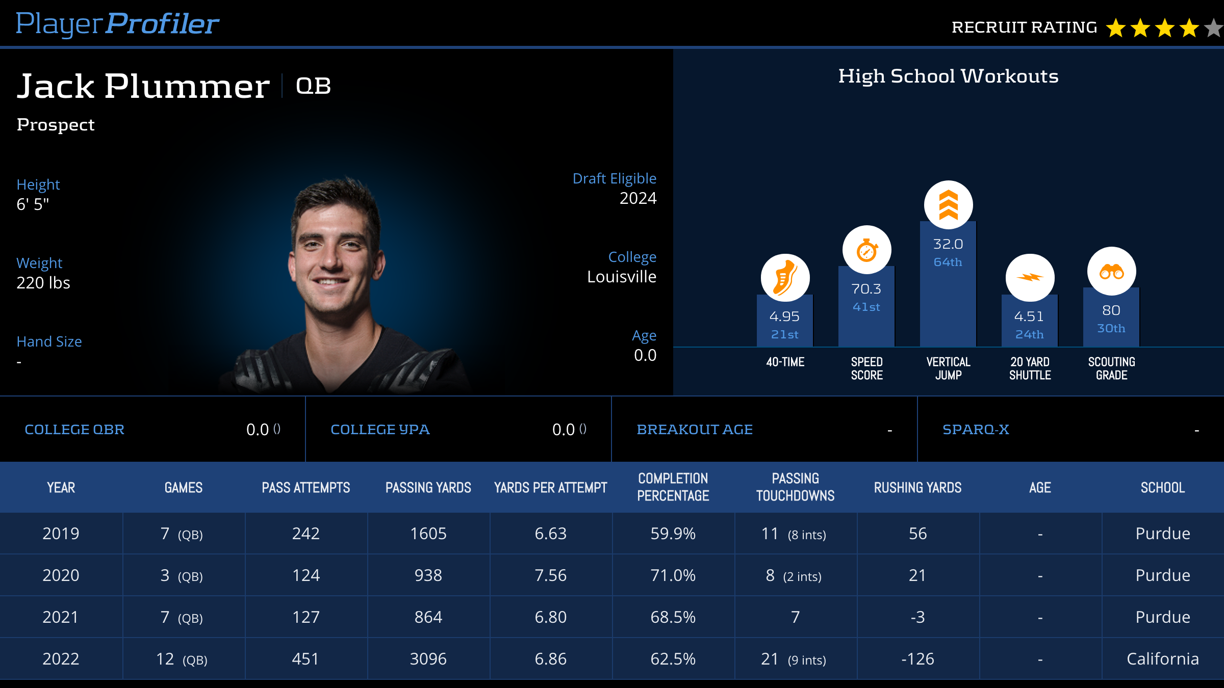 | Year Year | Games Games | Pass Attempts Pass Atts | Passing Yards Pass Yds | Yards Per Attempt YPA | Completion Percentage Comp % | Passing Touchdowns Pass TDs | Rushing Yards Rush Yds | Age Age | School School |