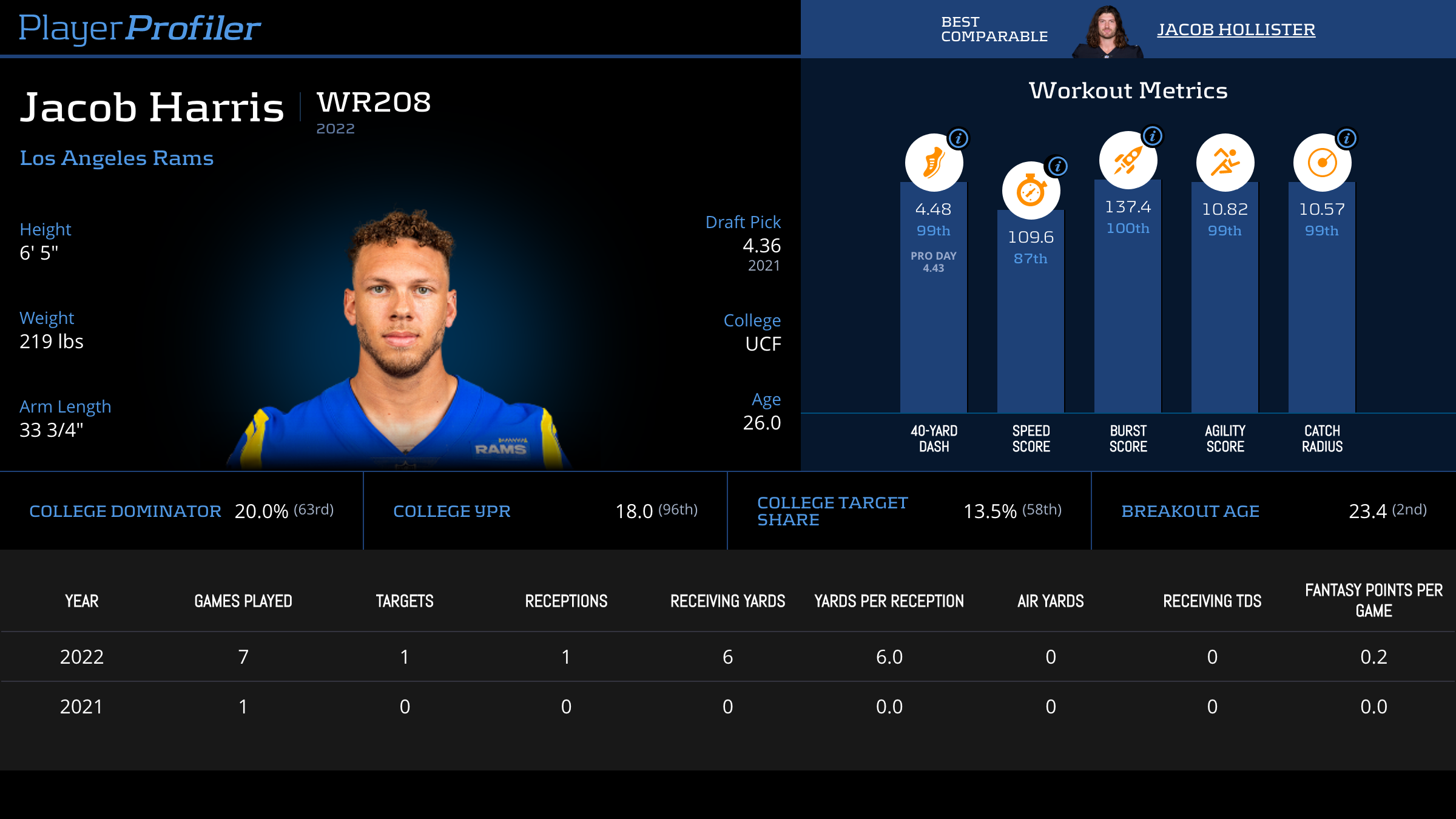 | Year Year | Games Games | Receptions Recs | Receiving Yards Rec Yds | Target Share Tgt Share | Catch Rate Catch Rate | Receiving Touchdowns Rec TDs | Special Teams Yards Special Teams | Age Age | School School |