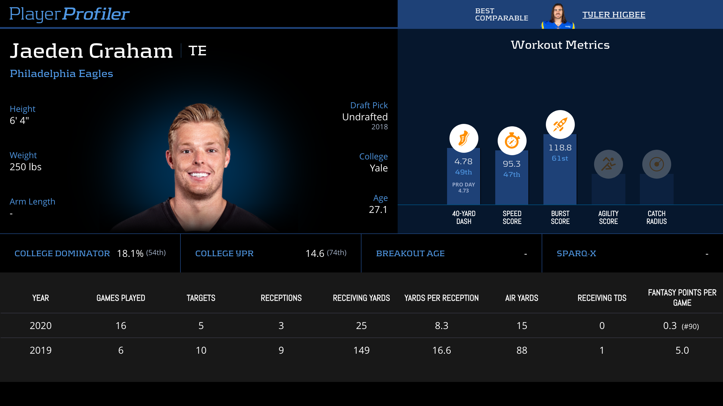 Box score statistics such as targets, yards, touchdowns, and fantasy points per target are updated the next day. Advanced stats and metrics are updated later in the week during the NFL season.