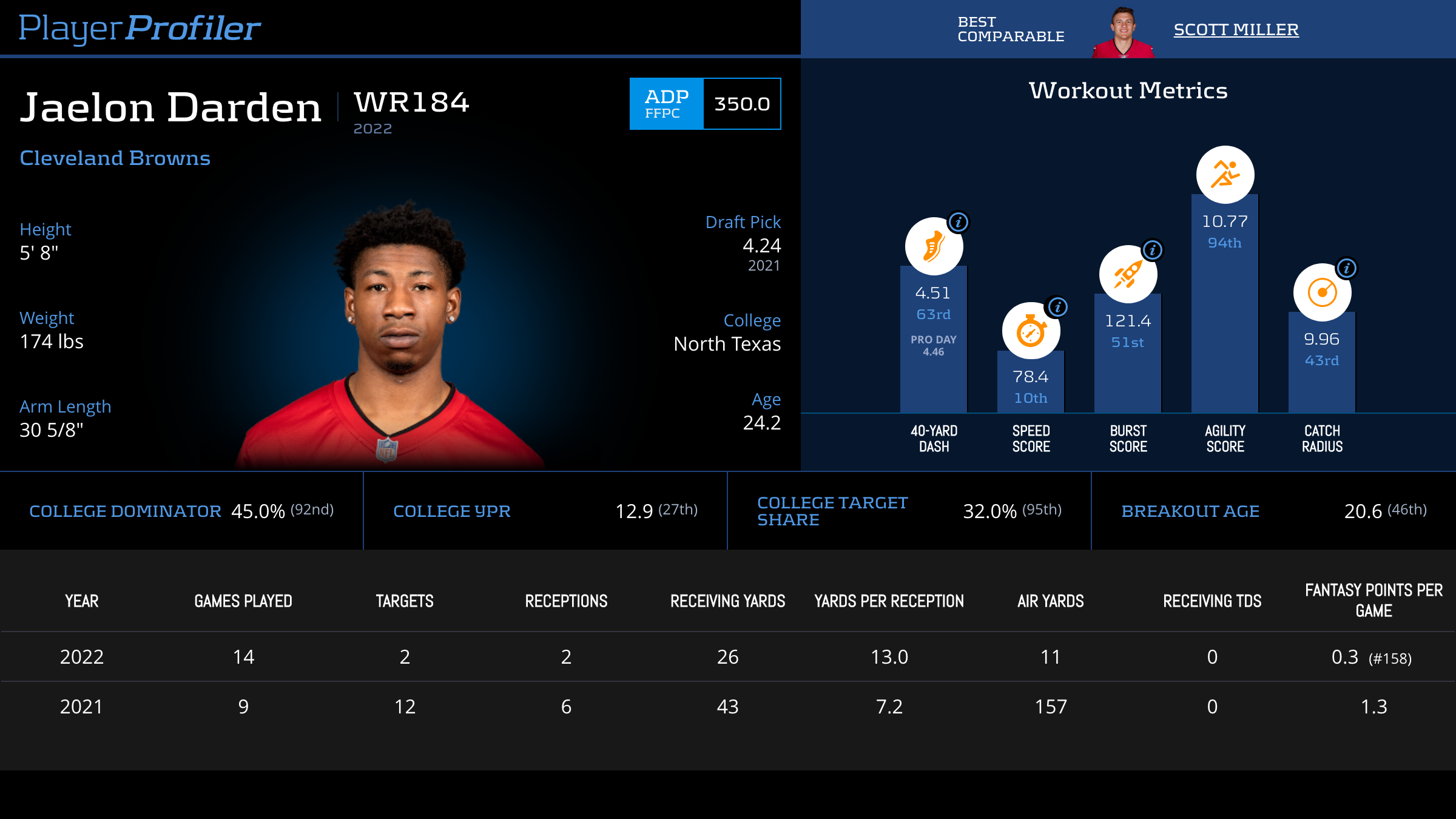 | Year Year | Games Games | Receptions Recs | Receiving Yards Rec Yds | Target Share Tgt Share | Catch Rate Catch Rate | Receiving Touchdowns Rec TDs | Special Teams Yards Special Teams | Age Age | School School |