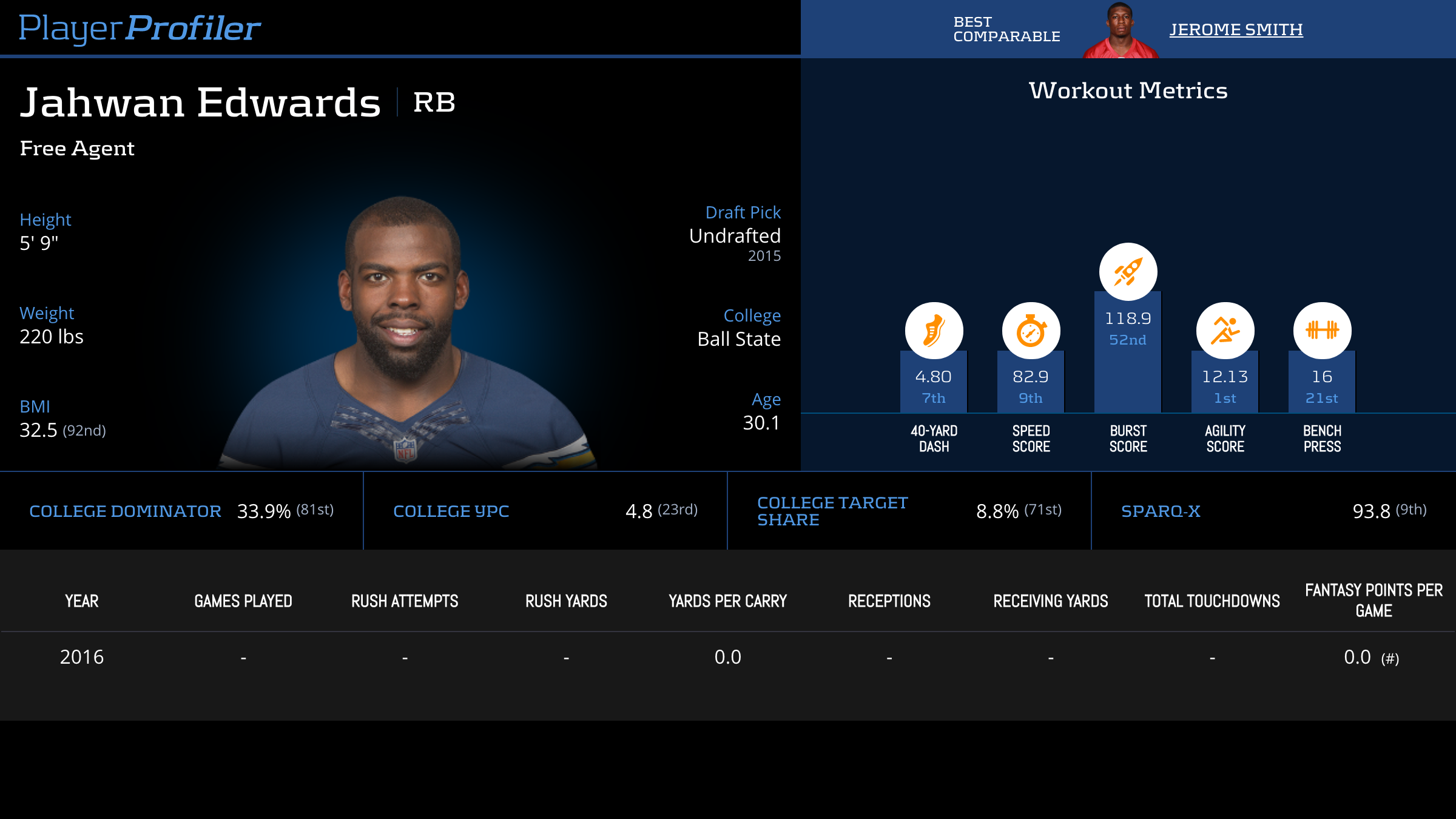 | Year Year | Games Games | Rush Attempts Rush Atts | Rushing Yards Rush Yrds | Total Touchdowns TDs | Receptions Rec | Receiving Yards Rec Yrds | Target Share Tgt Share | Age Age | School School |