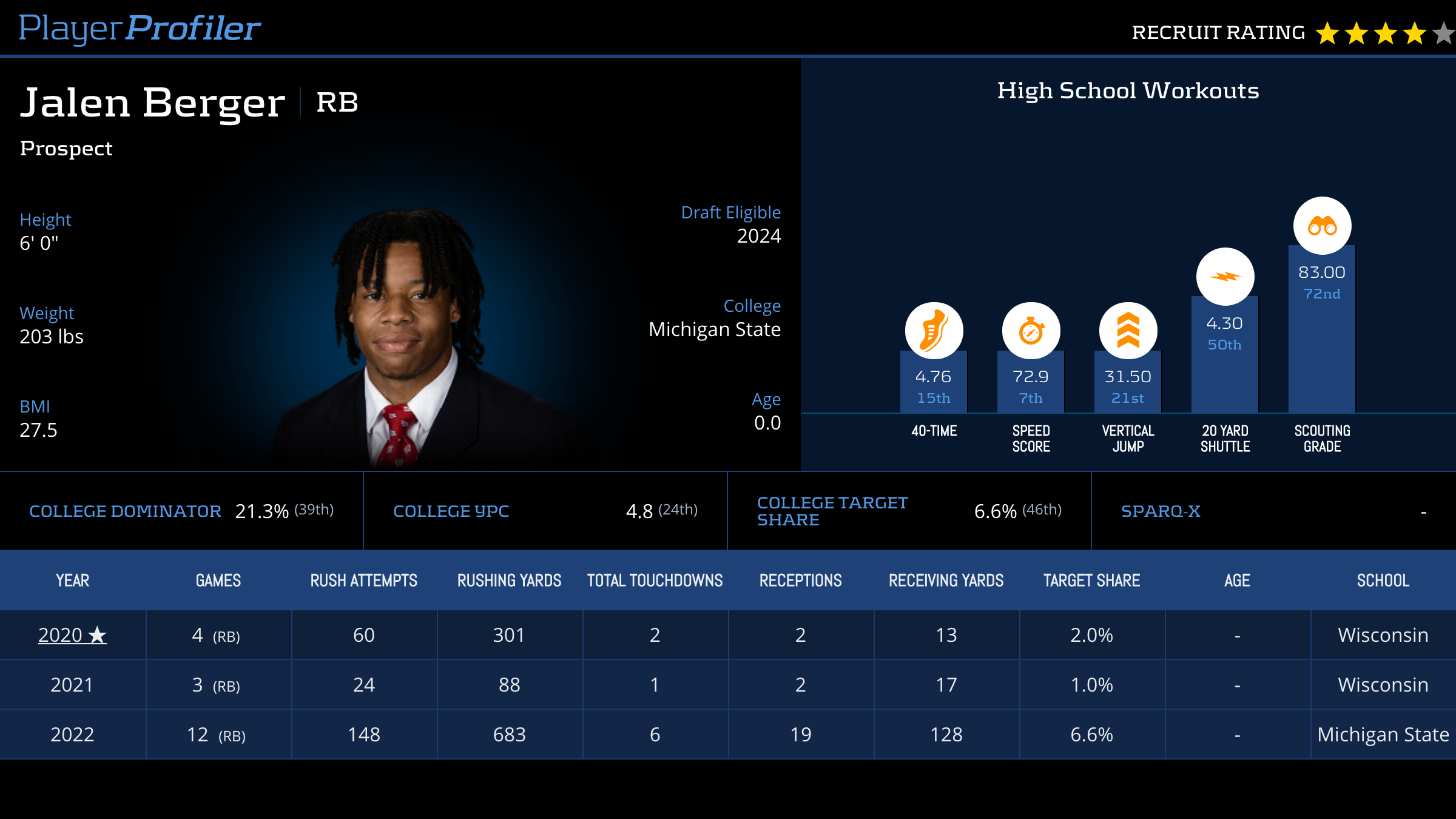 | Year Year | Games Games | Rush Attempts Rush Atts | Rushing Yards Rush Yrds | Total Touchdowns TDs | Receptions Rec | Receiving Yards Rec Yrds | Target Share Tgt Share | Age Age | School School |