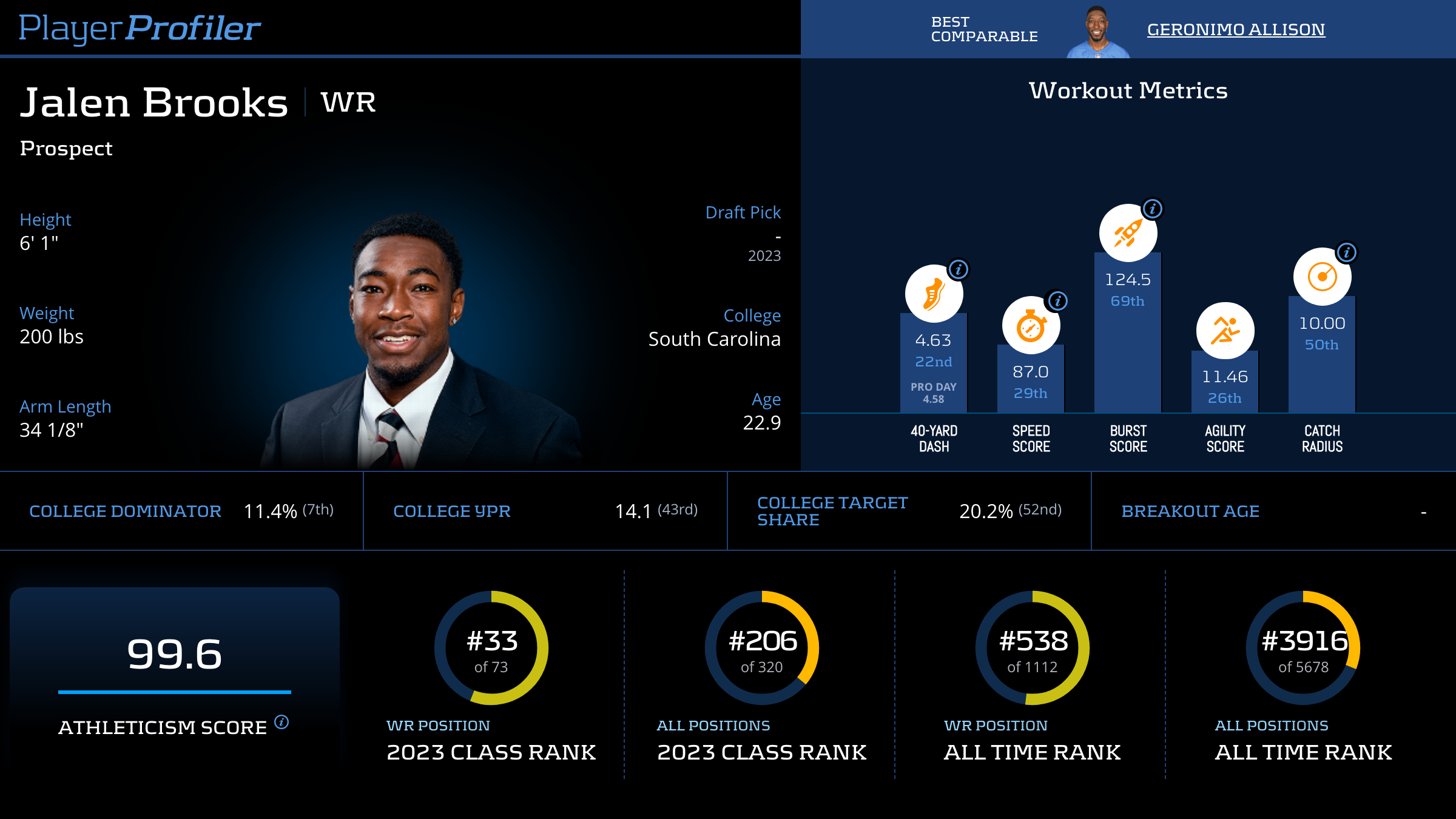 | Year Year | Games Games | Receptions Recs | Receiving Yards Rec Yds | Target Share Tgt Share | Catch Rate Catch Rate | Receiving Touchdowns Rec TDs | Special Teams Yards Special Teams | Age Age | School School |