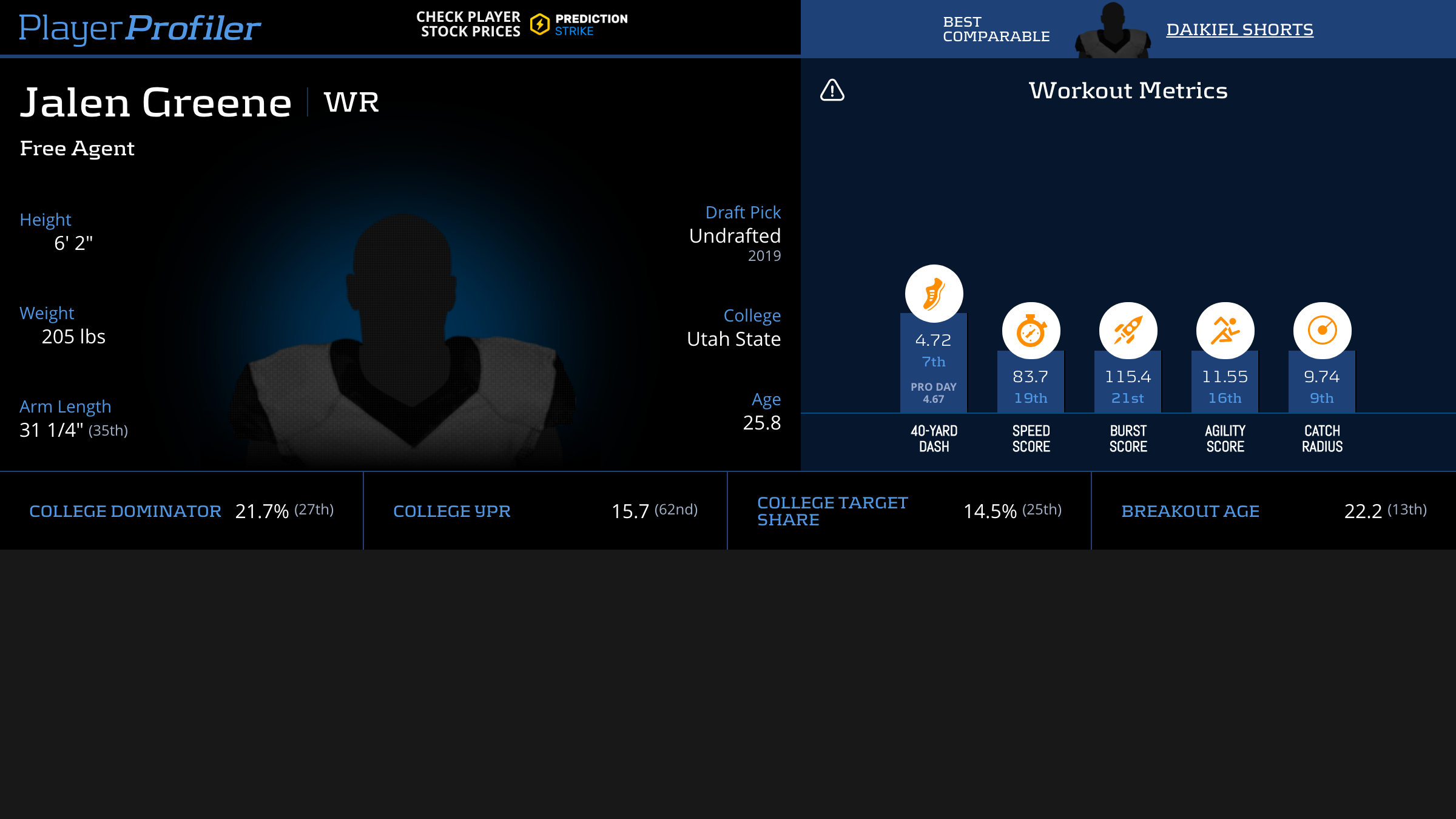 | Year Year | Games Games | Receptions Recs | Receiving Yards Rec Yds | Target Share Tgt Share | Catch Rate Catch Rate | Receiving Touchdowns Rec TDs | Special Teams Yards Special Teams | Age Age | School School |