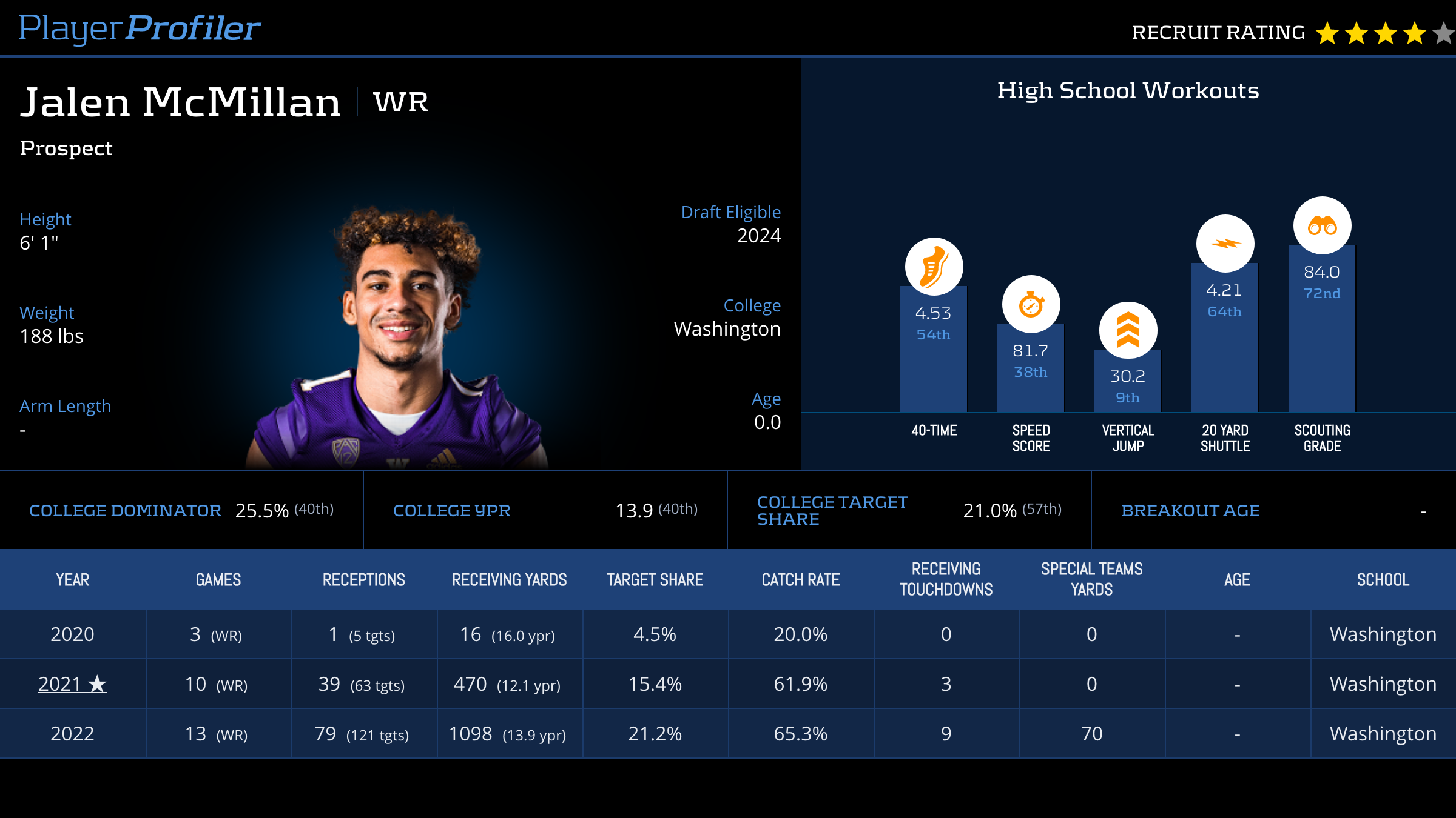 | Year Year | Games Games | Receptions Recs | Receiving Yards Rec Yds | Target Share Tgt Share | Catch Rate Catch Rate | Receiving Touchdowns Rec TDs | Special Teams Yards Special Teams | Age Age | School School |
