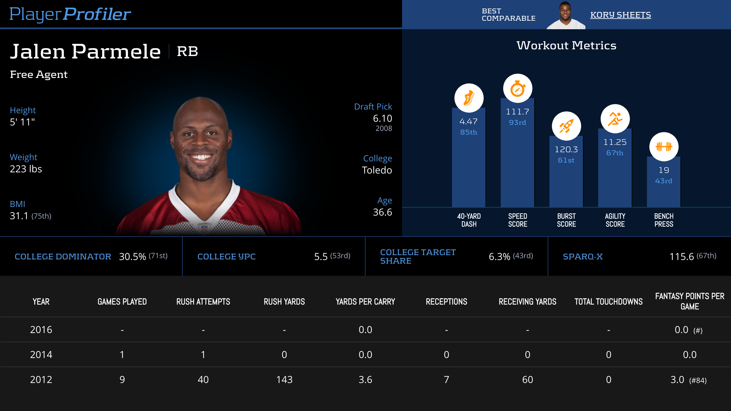 | Year Year | Games Games | Rush Attempts Rush Atts | Rushing Yards Rush Yrds | Total Touchdowns TDs | Receptions Rec | Receiving Yards Rec Yrds | Target Share Tgt Share | Age Age | School School |