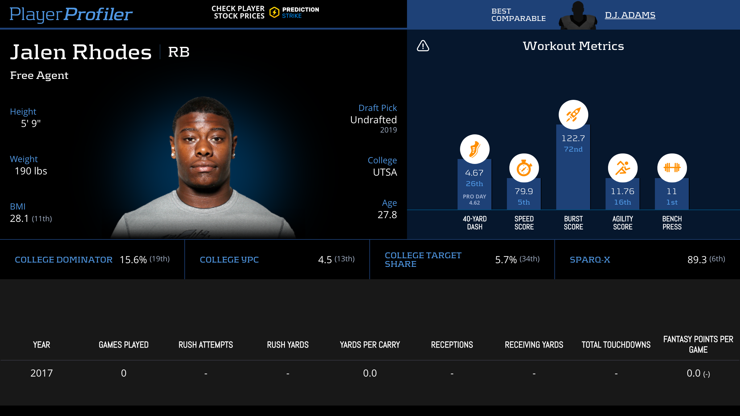 | Year Year | Games Games | Rush Attempts Rush Atts | Rushing Yards Rush Yrds | Total Touchdowns TDs | Receptions Rec | Receiving Yards Rec Yrds | Target Share Tgt Share | Age Age | School School |