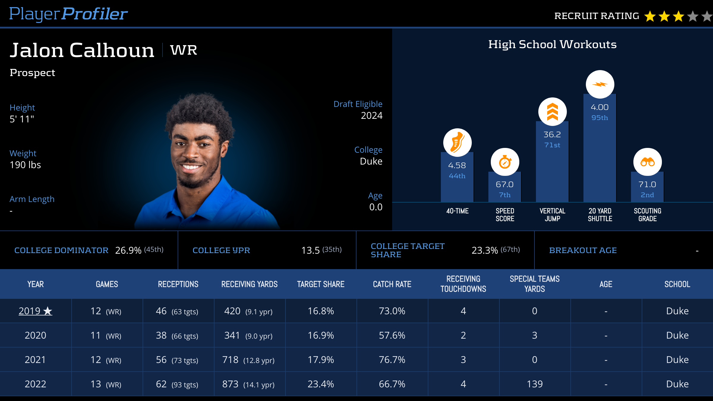 | Year Year | Games Games | Receptions Recs | Receiving Yards Rec Yds | Target Share Tgt Share | Catch Rate Catch Rate | Receiving Touchdowns Rec TDs | Special Teams Yards Special Teams | Age Age | School School |