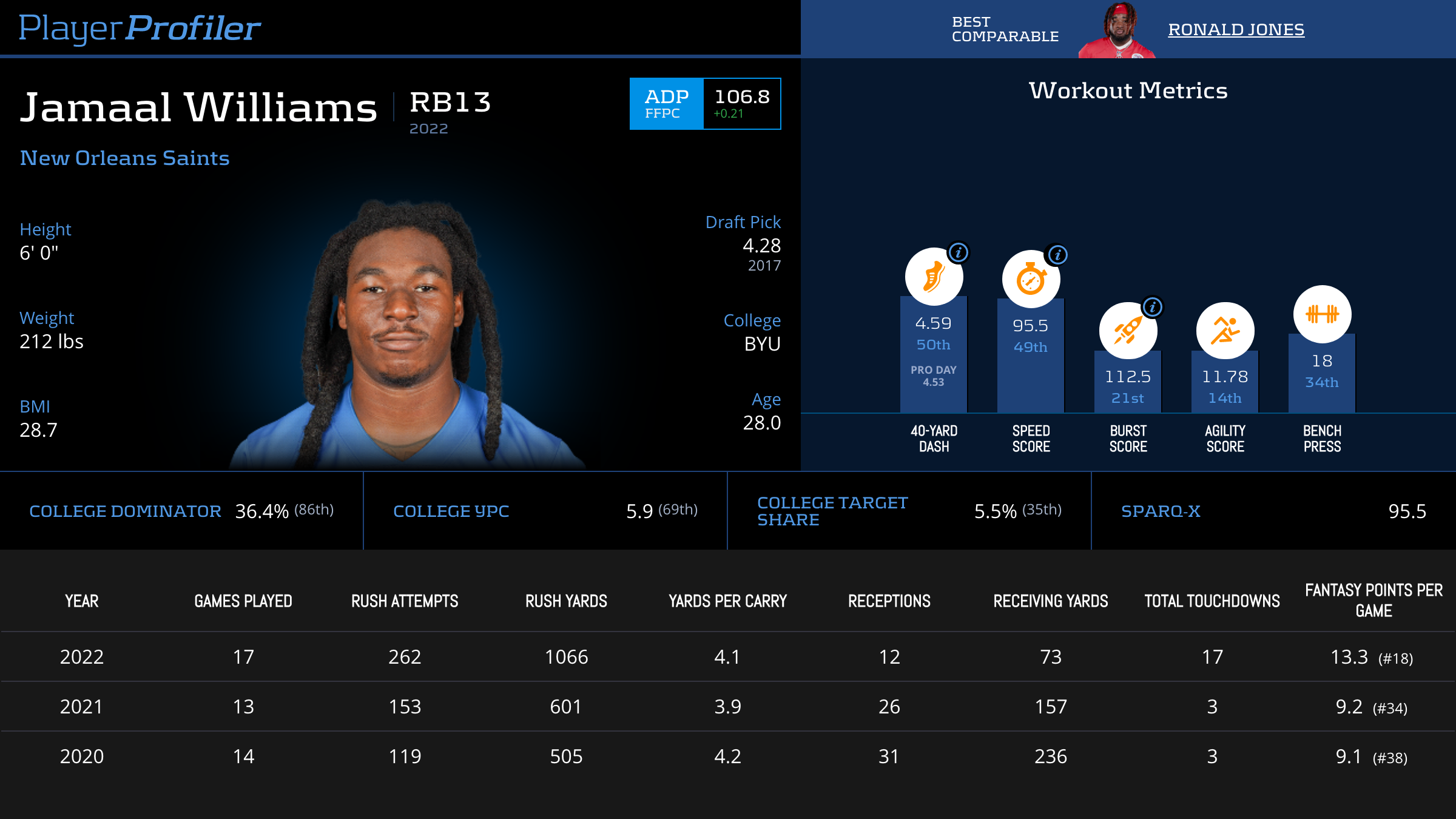 | Year Year | Games Games | Rush Attempts Rush Atts | Rushing Yards Rush Yrds | Total Touchdowns TDs | Receptions Rec | Receiving Yards Rec Yrds | Target Share Tgt Share | Age Age | School School |