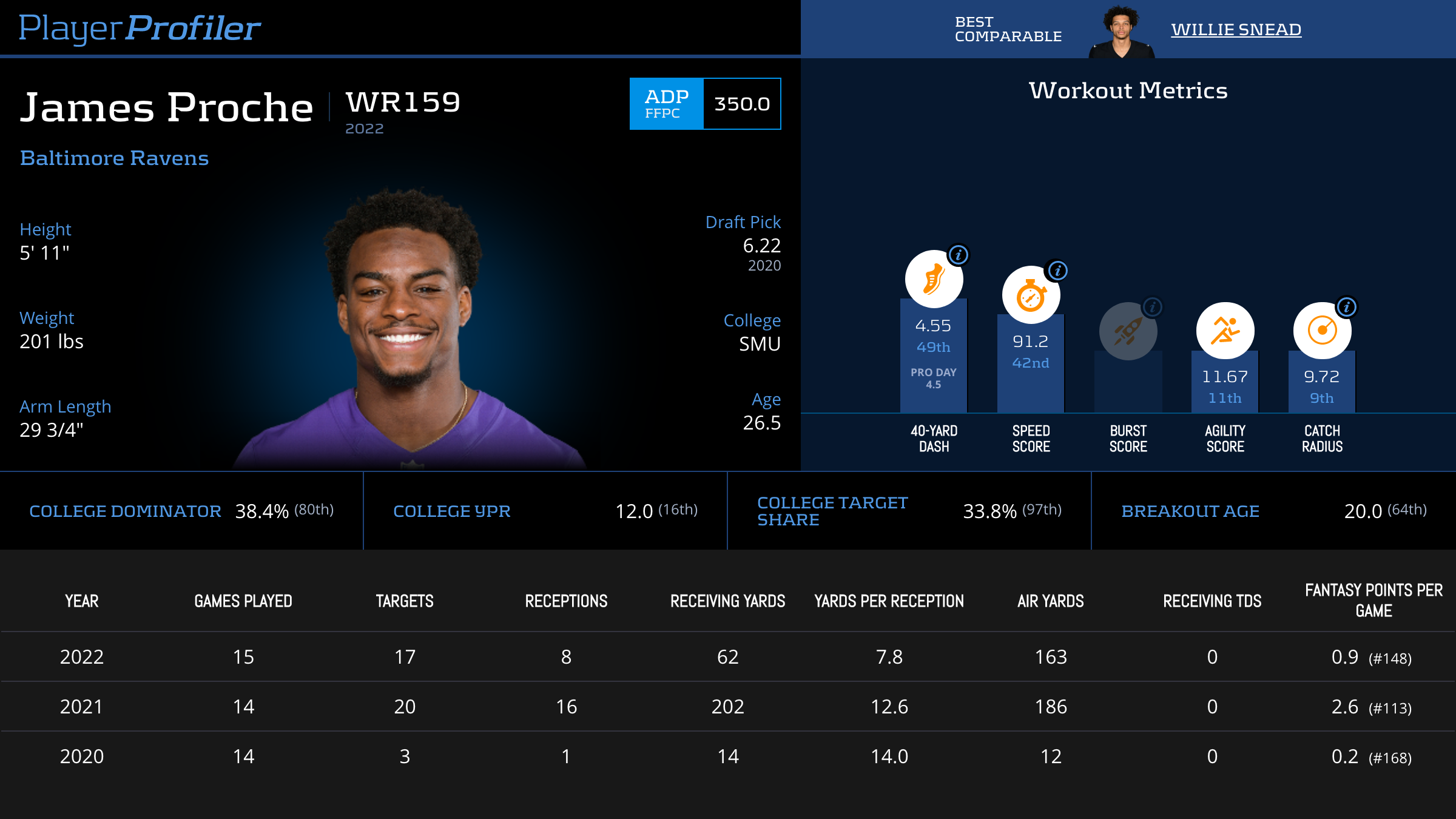 | 14 | CLE | Denzel Ward | 13.6% | 5 (17.2% rate) | 1 | -- | 0 (12 air) | 0.0 (#100) |