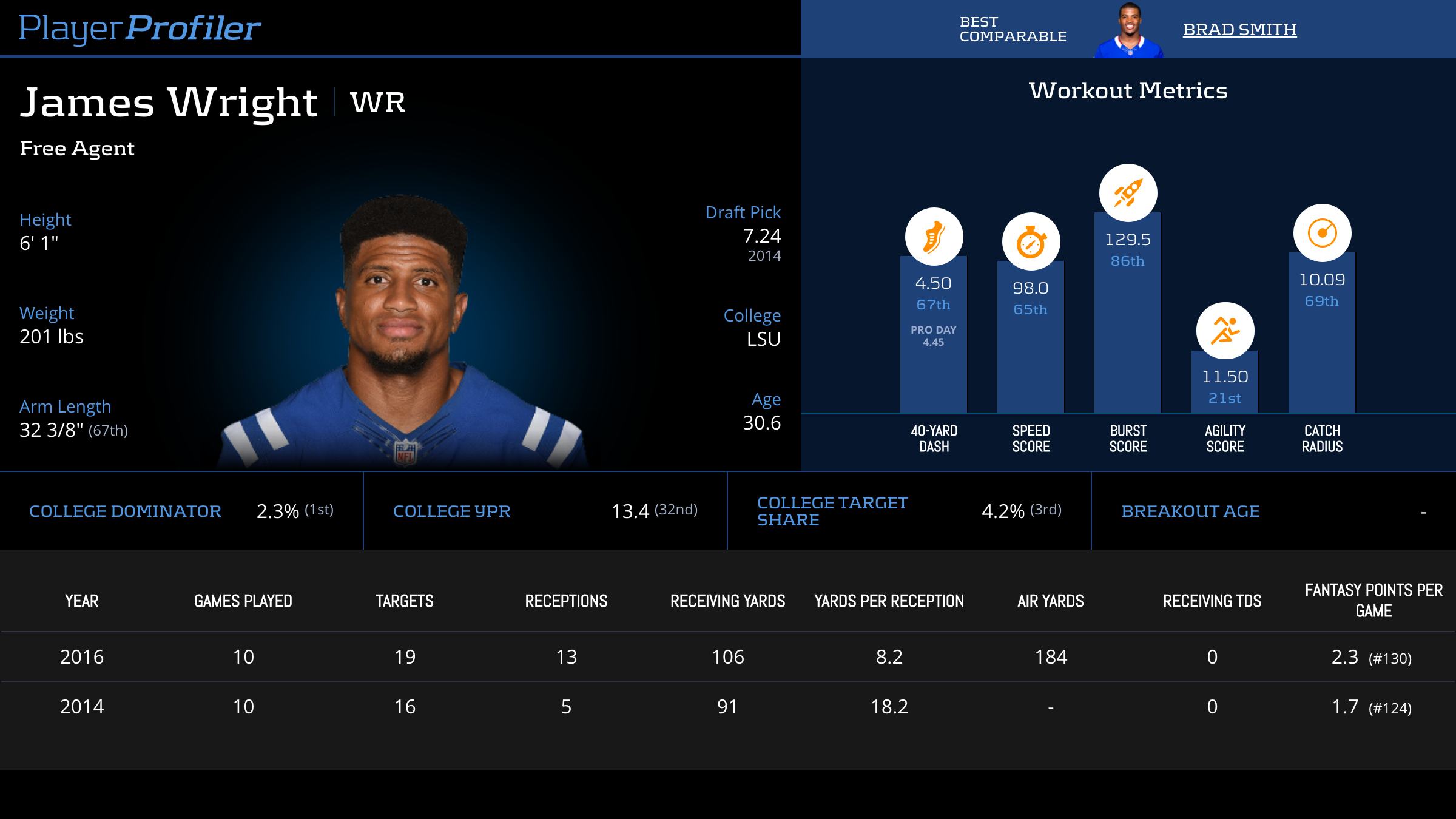 Box score statistics such as targets, yards, touchdowns, and fantasy points per target are updated the next day. Advanced stats and metrics are updated later in the week during the NFL season.