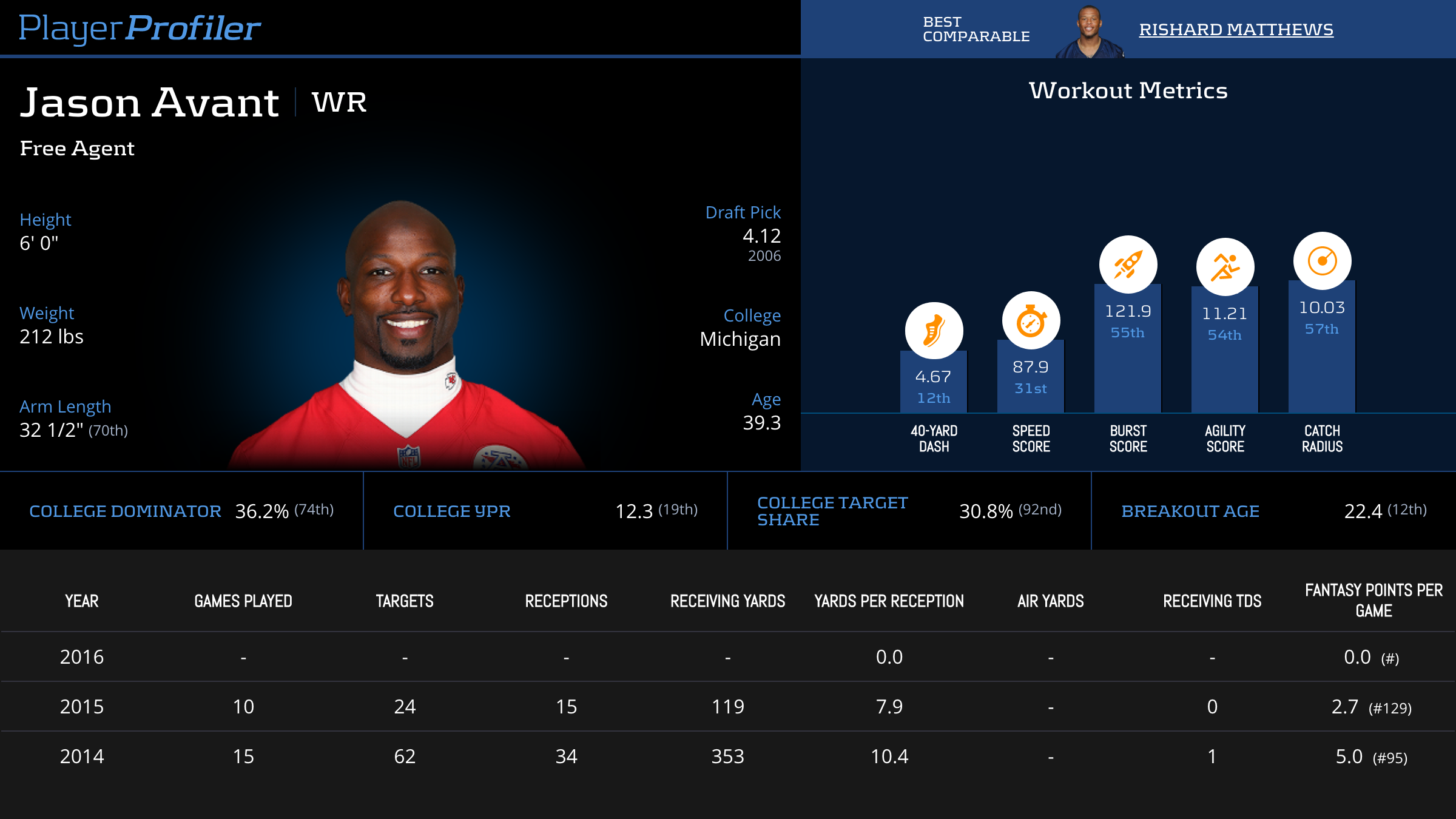 Box score statistics such as targets, yards, touchdowns, and fantasy points per target are updated the next day. Advanced stats and metrics are updated later in the week during the NFL season.
