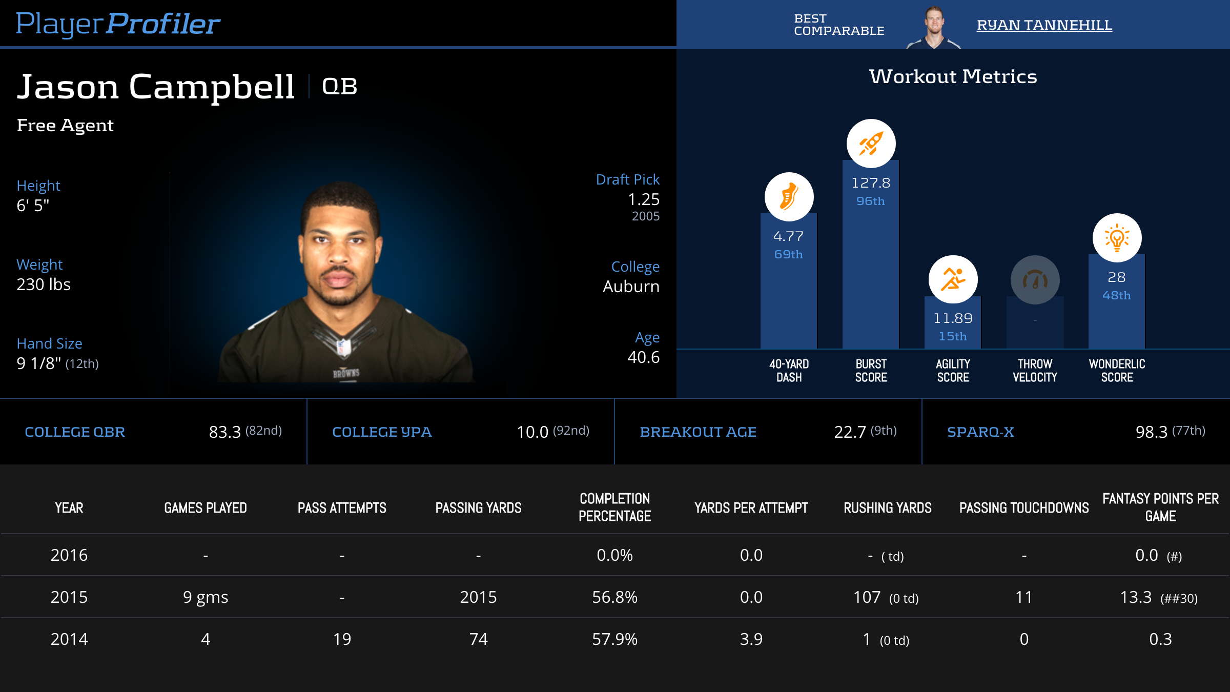 | Year Year | Games Games | Pass Attempts Pass Atts | Passing Yards Pass Yds | Yards Per Attempt YPA | Completion Percentage Comp % | Passing Touchdowns Pass TDs | Rushing Yards Rush Yds | Age Age | School School |