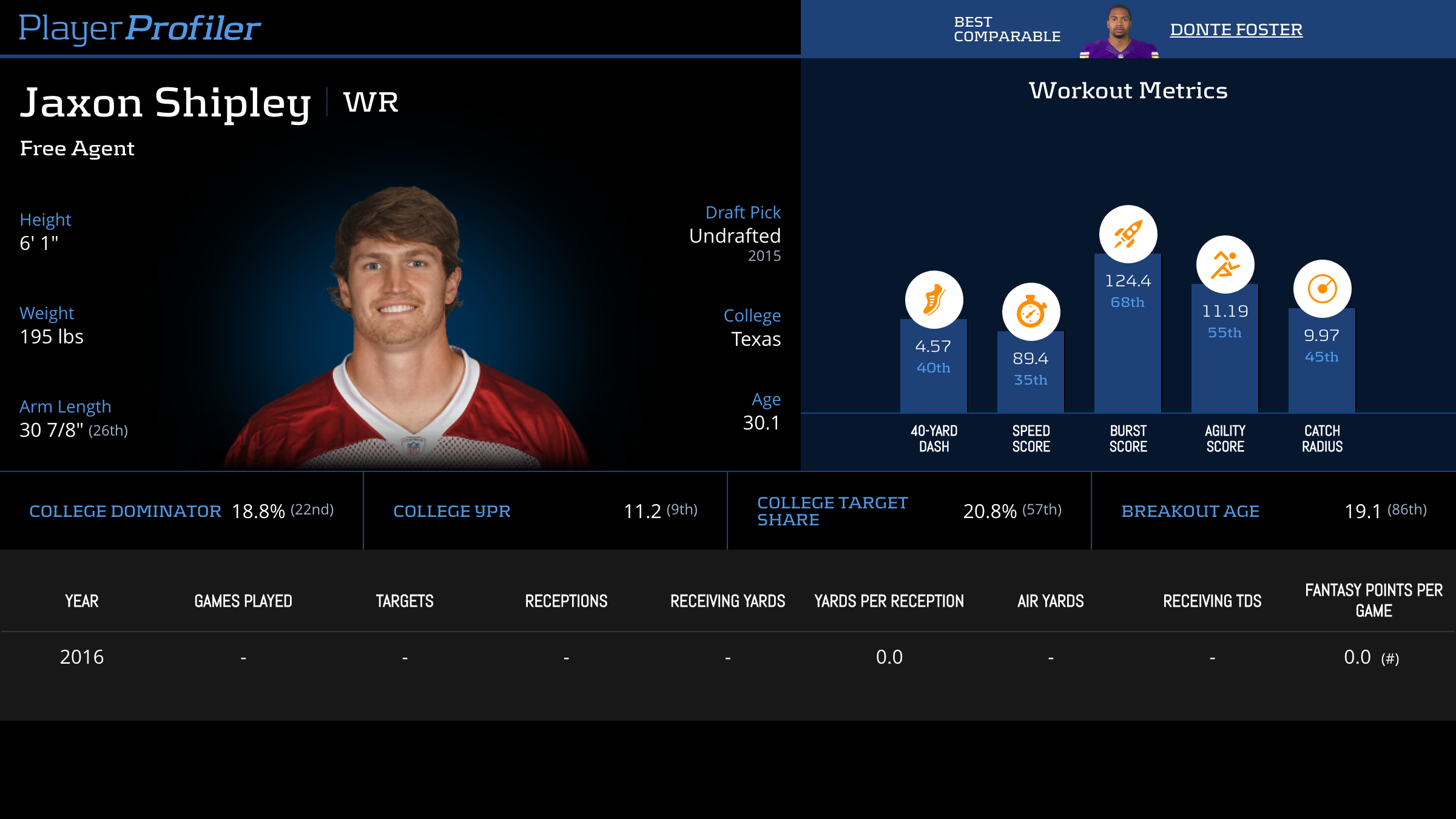 | Year Year | Games Games | Receptions Recs | Receiving Yards Rec Yds | Target Share Tgt Share | Catch Rate Catch Rate | Receiving Touchdowns Rec TDs | Special Teams Yards Special Teams | Age Age | School School |
