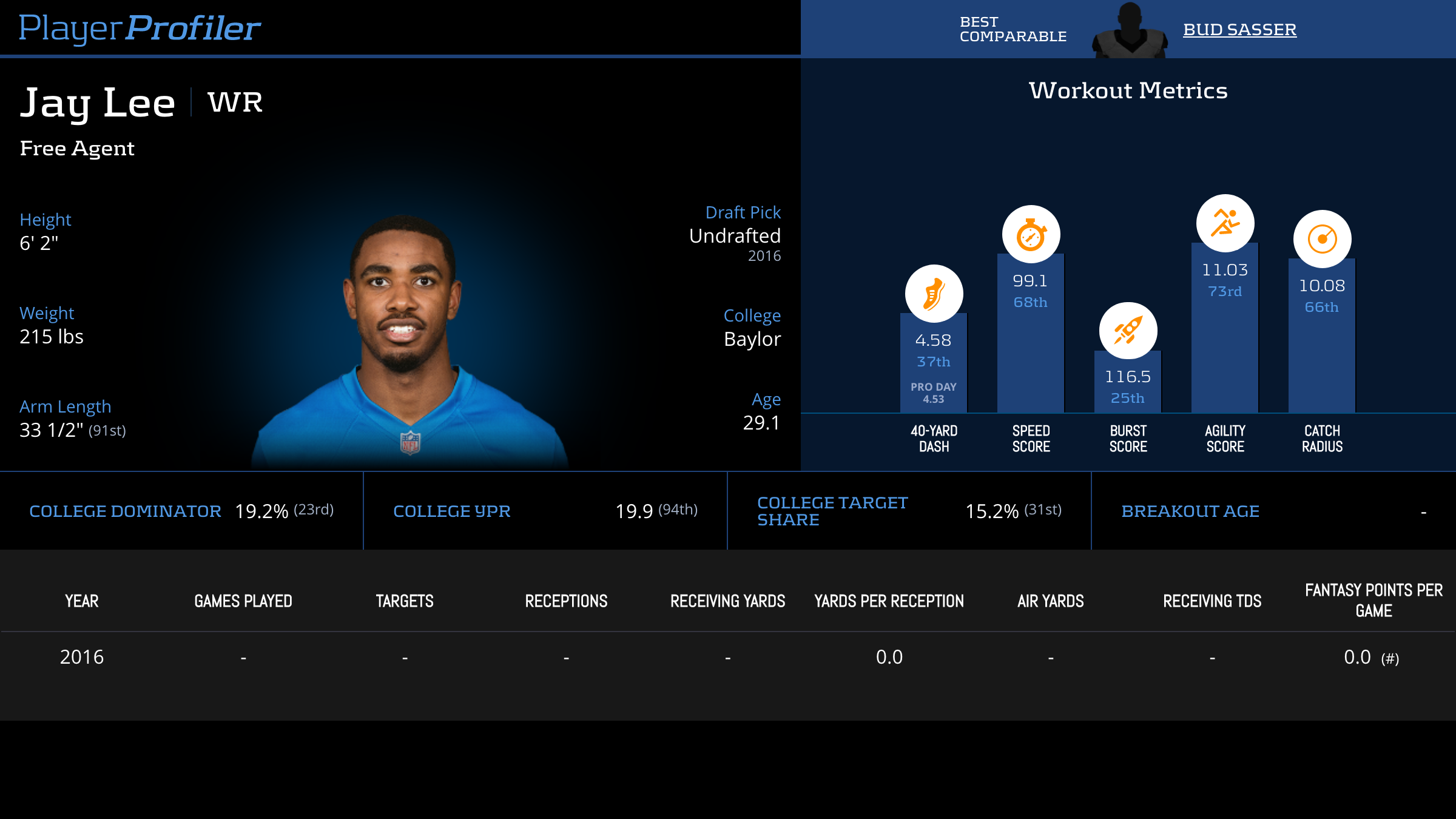 | Year Year | Games Games | Receptions Recs | Receiving Yards Rec Yds | Target Share Tgt Share | Catch Rate Catch Rate | Receiving Touchdowns Rec TDs | Special Teams Yards Special Teams | Age Age | School School |