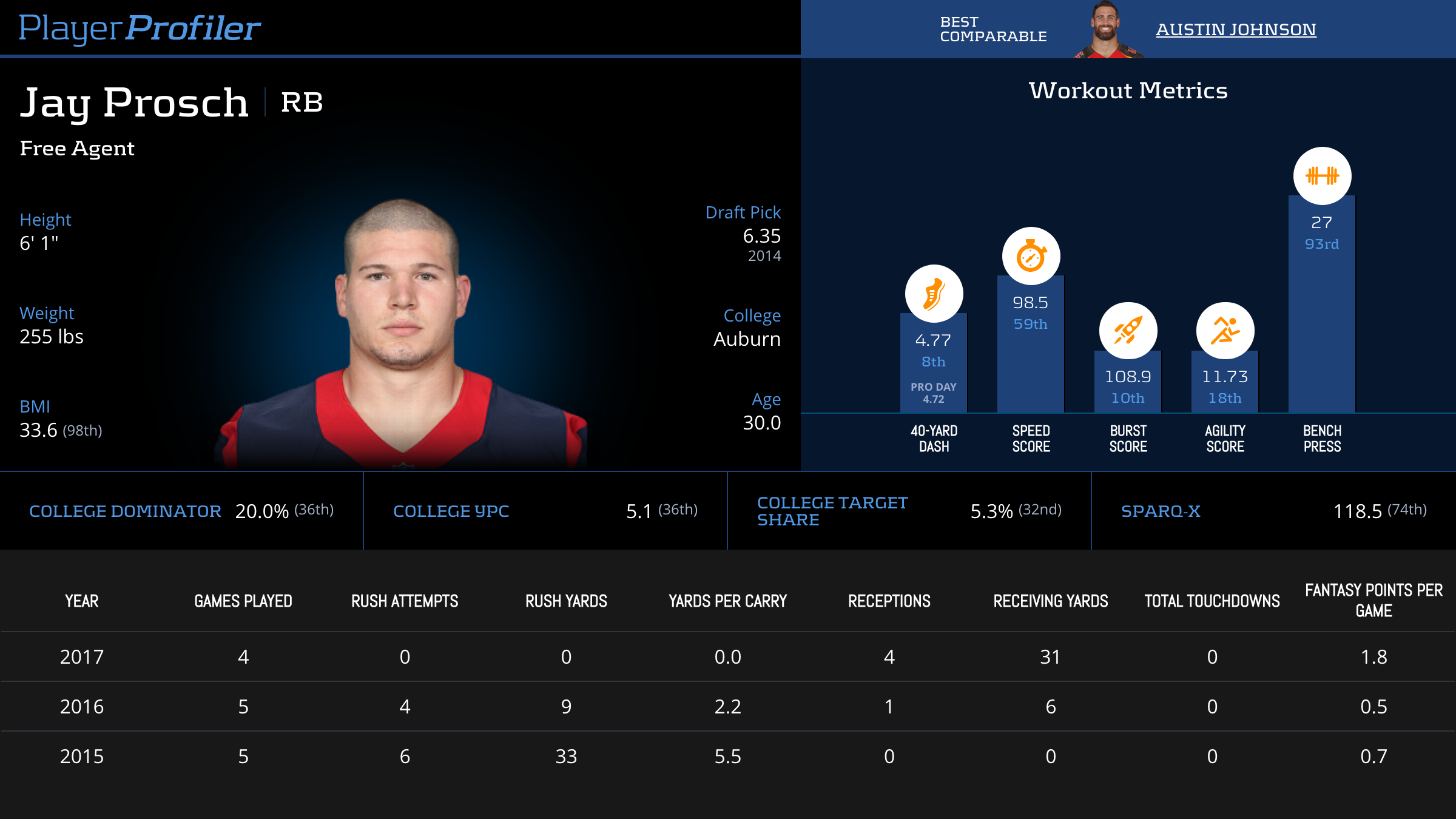 | Year Year | Games Games | Rush Attempts Rush Atts | Rushing Yards Rush Yrds | Total Touchdowns TDs | Receptions Rec | Receiving Yards Rec Yrds | Target Share Tgt Share | Age Age | School School |