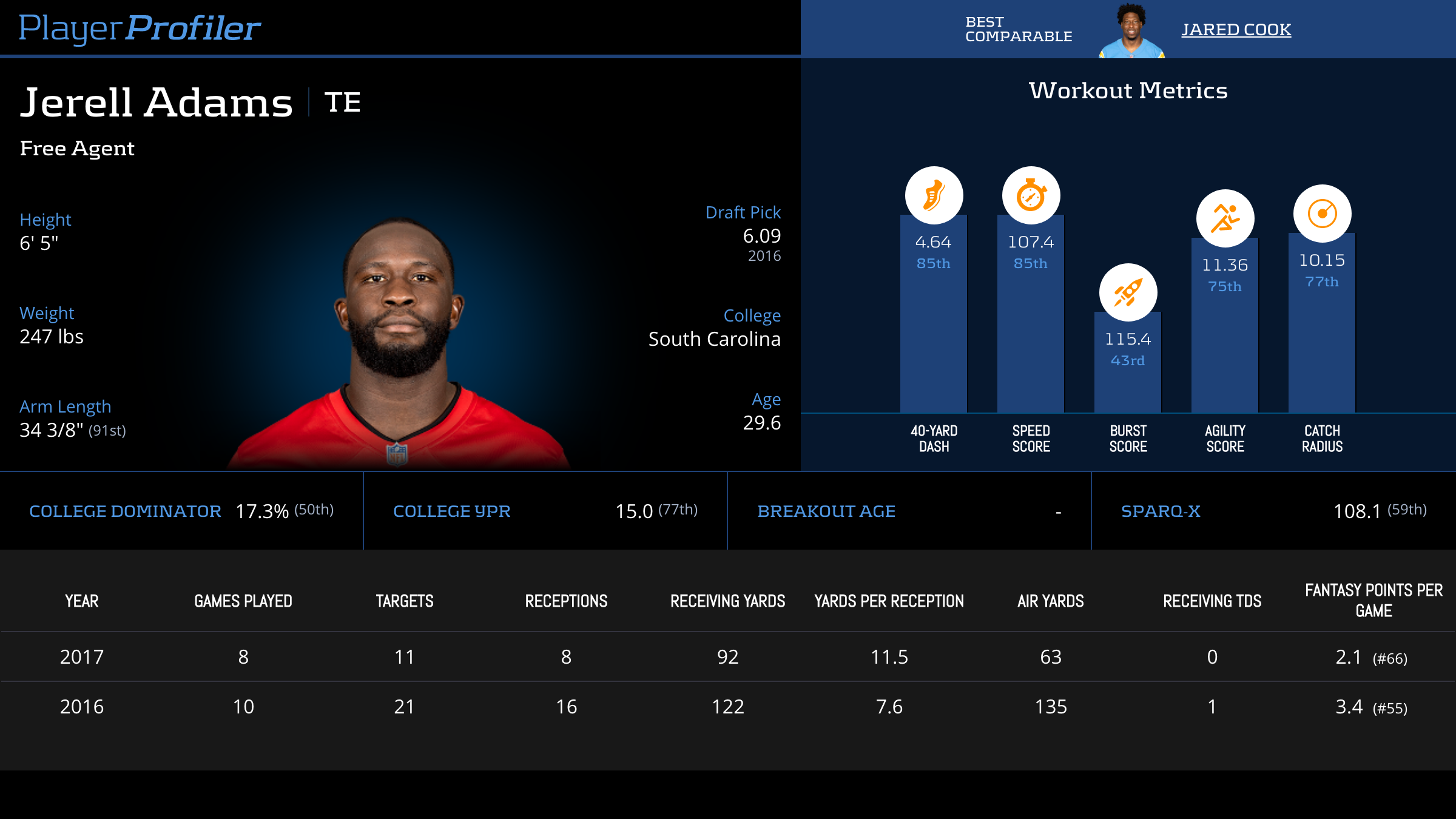 | Year Year | Games Games | Receptions Recs | Receiving Yards Rec Yds | Target Share Tgt Share | Catch Rate Catch Rate | Receiving Touchdowns Rec TDs | Special Teams Yards Special Teams | Age Age | School School |
