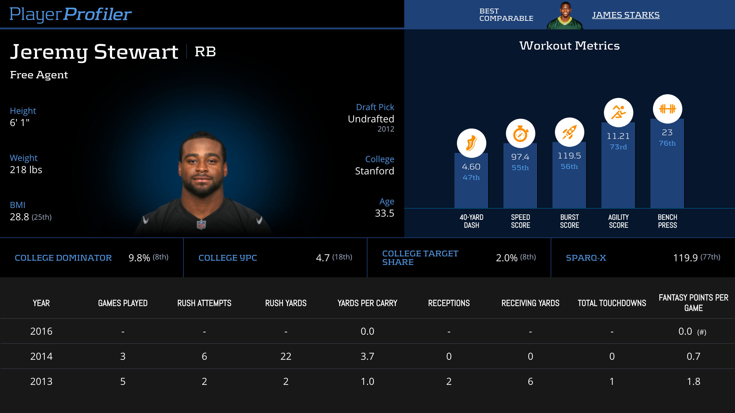 | 15 | SD | 3.3% | -- | -- | 0 tgts | -- | 16 | -- | 1.6 |