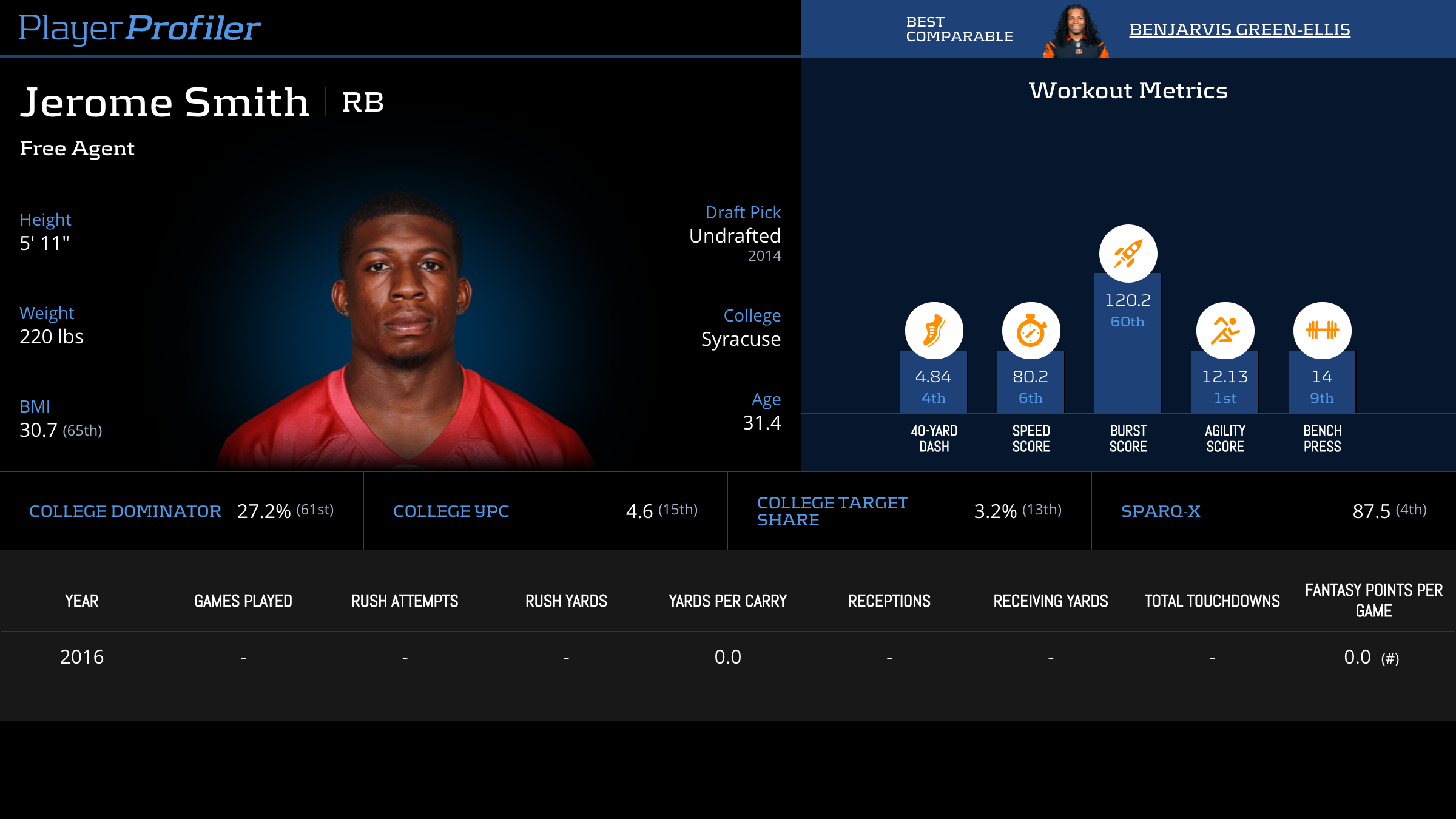 | Year Year | Games Games | Rush Attempts Rush Atts | Rushing Yards Rush Yrds | Total Touchdowns TDs | Receptions Rec | Receiving Yards Rec Yrds | Target Share Tgt Share | Age Age | School School |