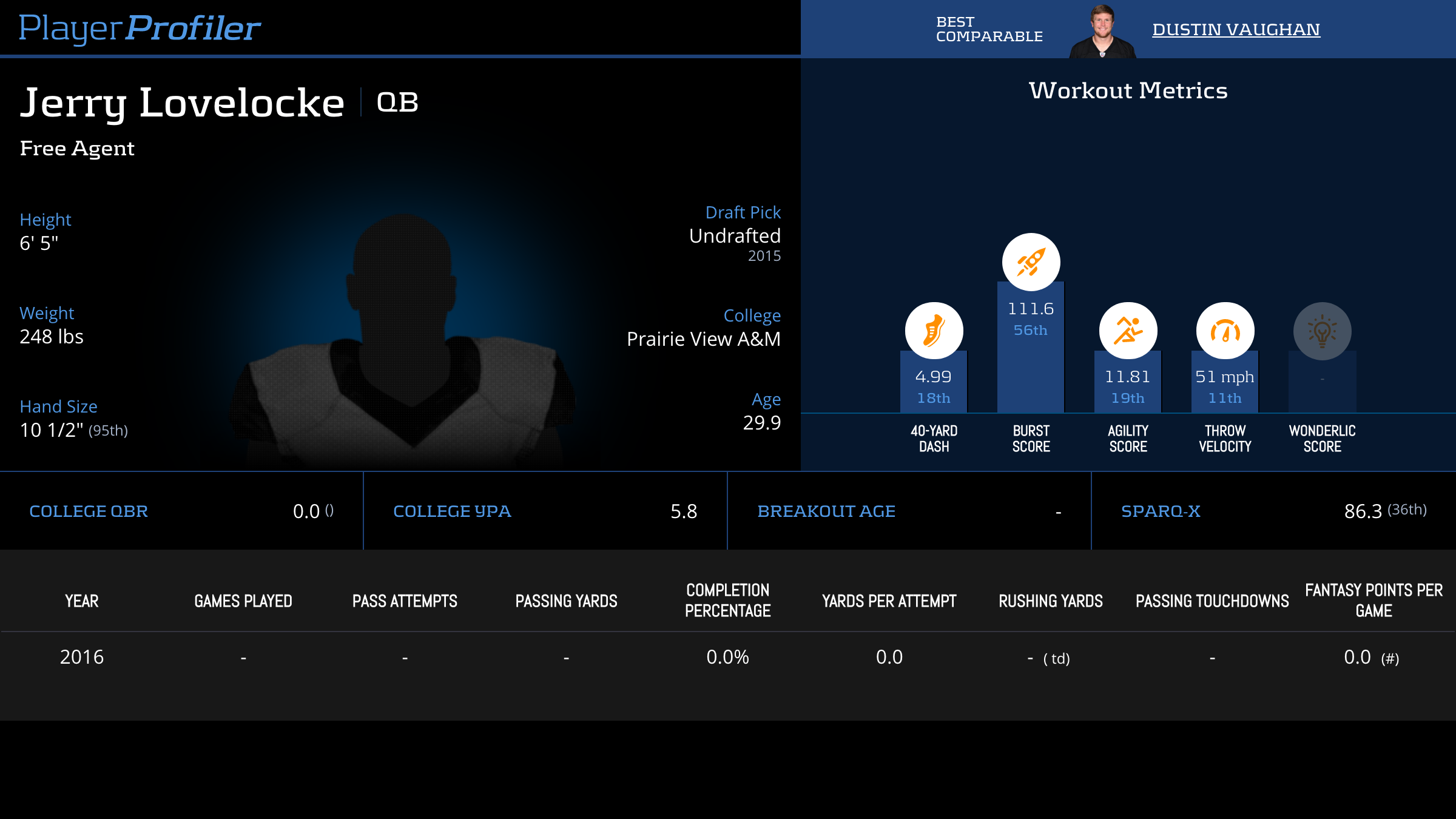 | Year Year | Games Games | Pass Attempts Pass Atts | Passing Yards Pass Yds | Yards Per Attempt YPA | Completion Percentage Comp % | Passing Touchdowns Pass TDs | Rushing Yards Rush Yds | Age Age | School School |