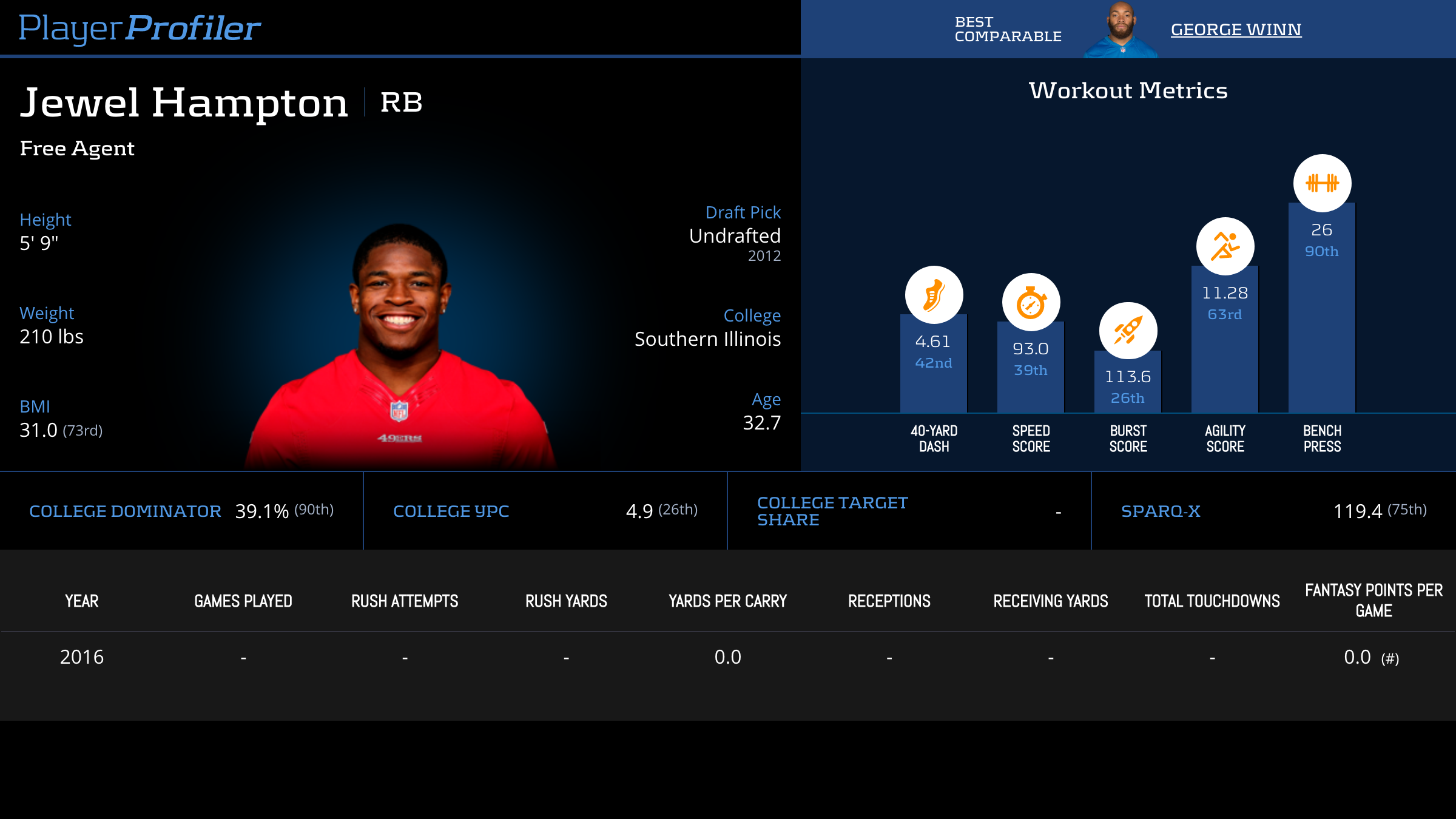 | Year Year | Games Games | Rush Attempts Rush Atts | Rushing Yards Rush Yrds | Total Touchdowns TDs | Receptions Rec | Receiving Yards Rec Yrds | Target Share Tgt Share | Age Age | School School |