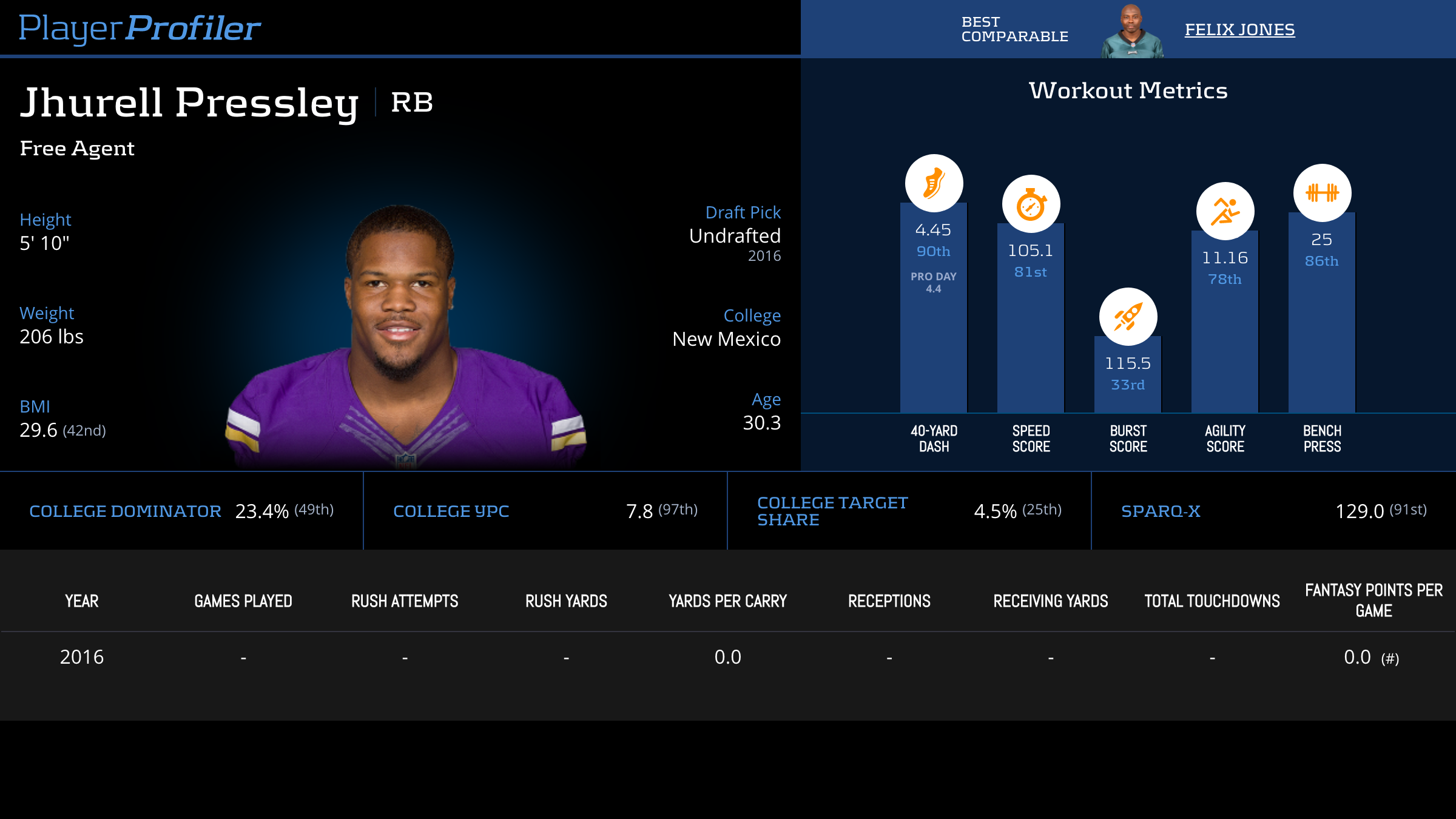 | Year Year | Games Games | Rush Attempts Rush Atts | Rushing Yards Rush Yrds | Total Touchdowns TDs | Receptions Rec | Receiving Yards Rec Yrds | Target Share Tgt Share | Age Age | School School |