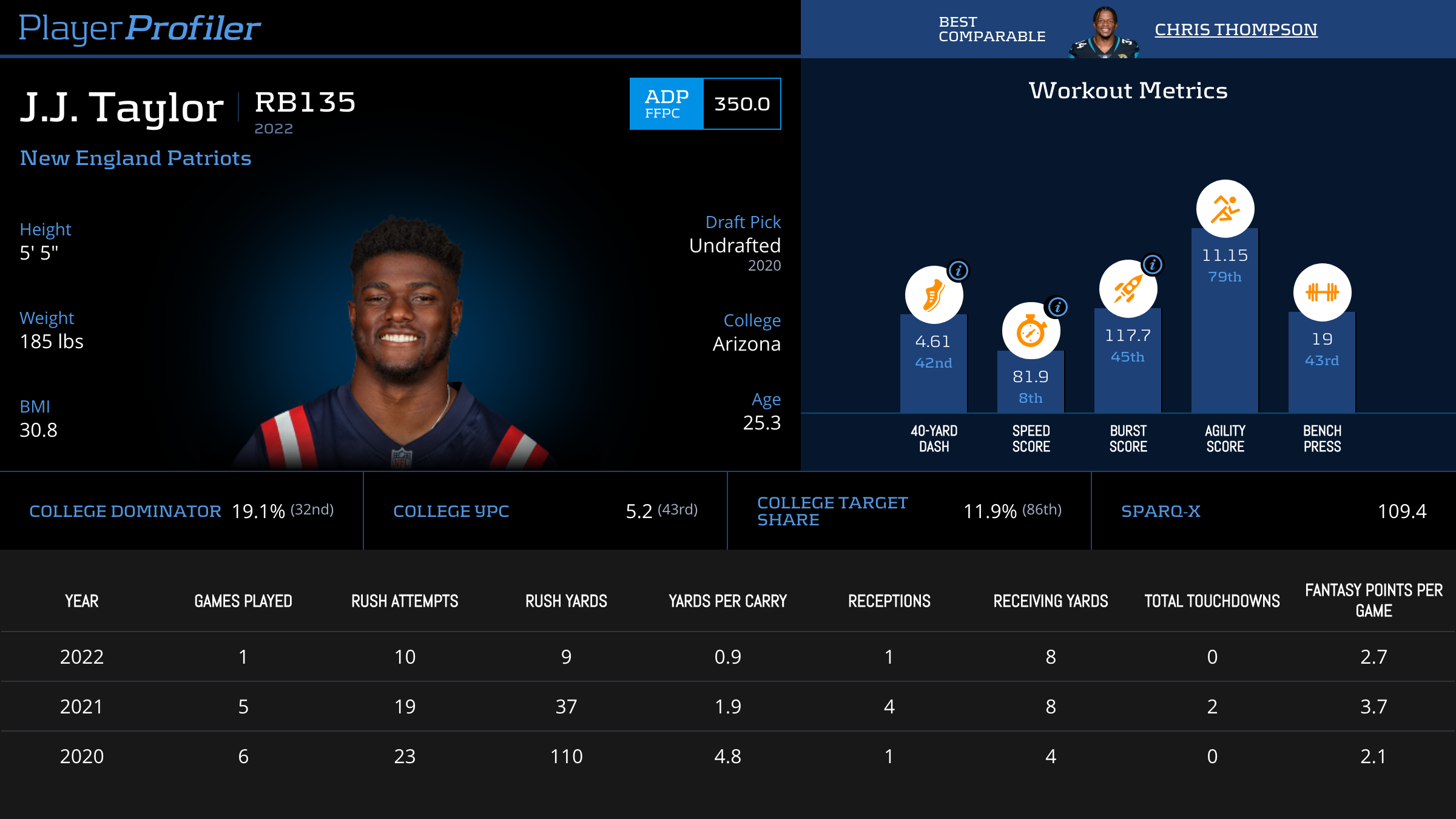 | Year Year | Games Games | Rush Attempts Rush Atts | Rushing Yards Rush Yrds | Total Touchdowns TDs | Receptions Rec | Receiving Yards Rec Yrds | Target Share Tgt Share | Age Age | School School |