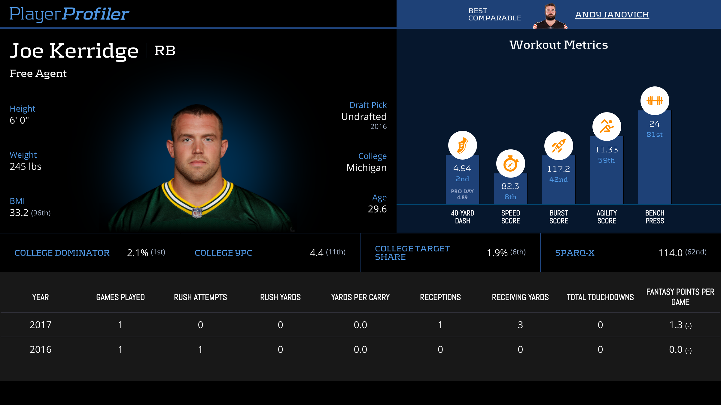 | Year Year | Games Games | Rush Attempts Rush Atts | Rushing Yards Rush Yrds | Total Touchdowns TDs | Receptions Rec | Receiving Yards Rec Yrds | Target Share Tgt Share | Age Age | School School |