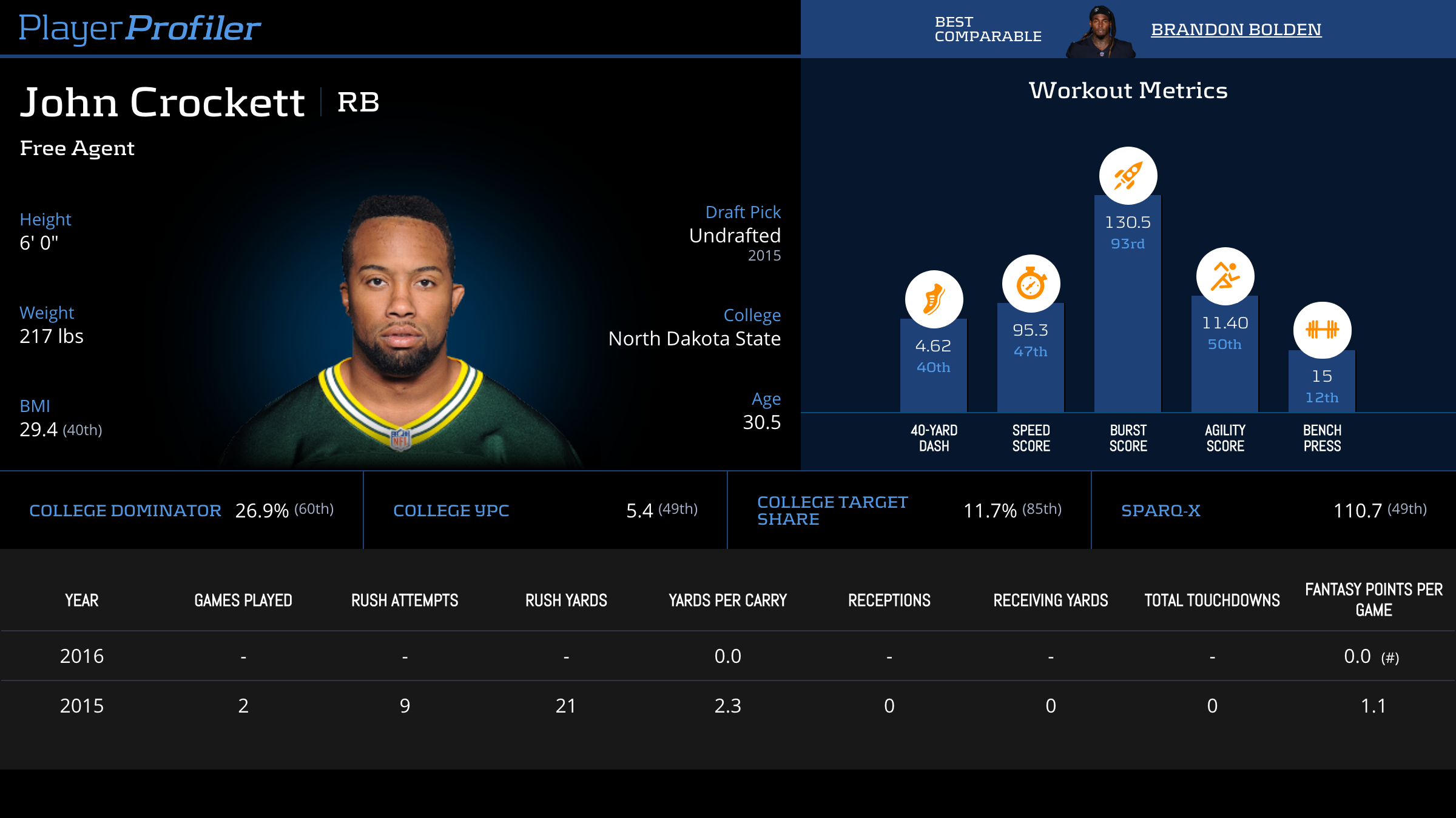 | 13 | DET | 8.3% | 5 | -- | 0 tgts | -- | 22 | -- | 2.2 |