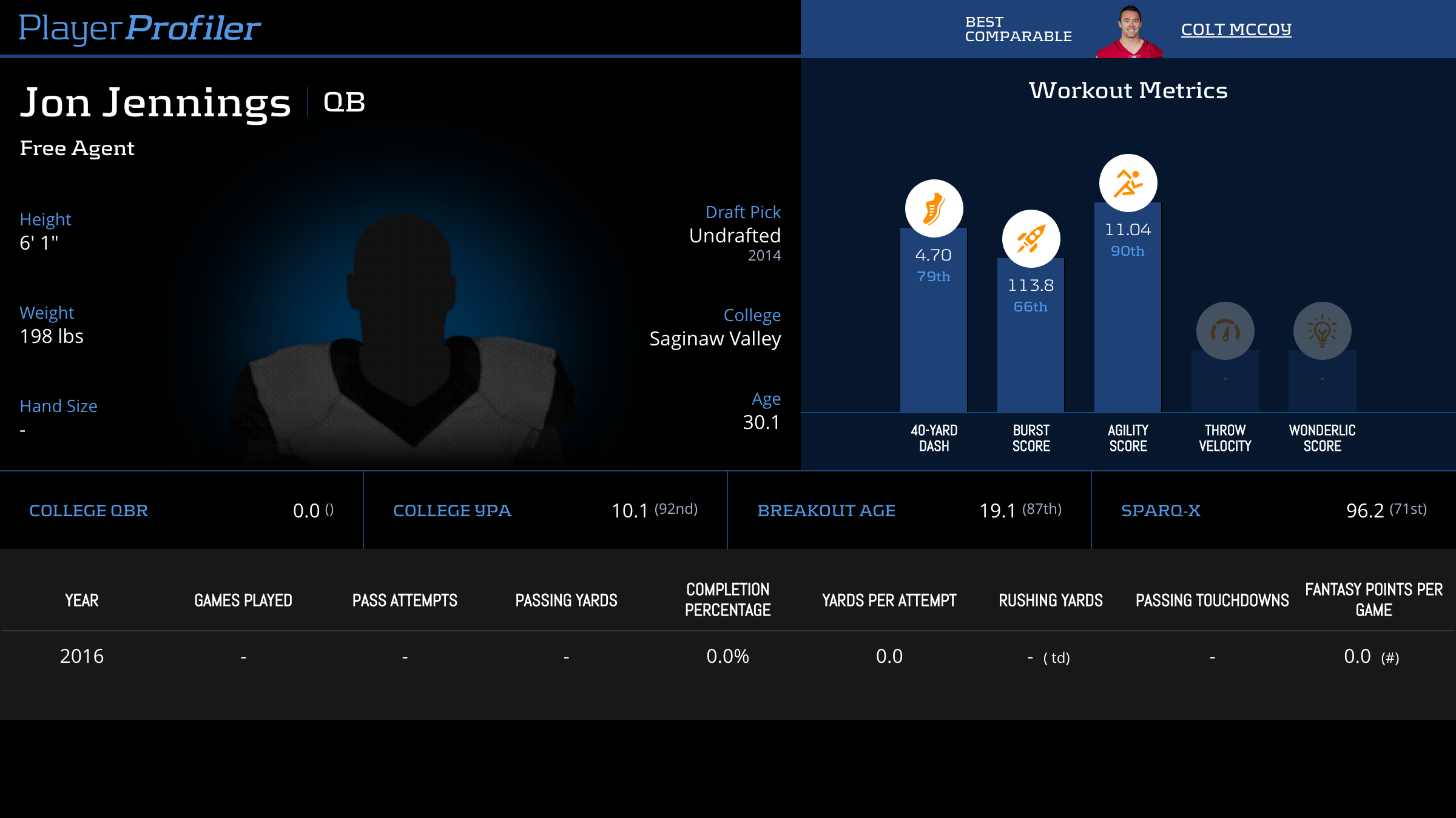 | Year Year | Games Games | Pass Attempts Pass Atts | Passing Yards Pass Yds | Yards Per Attempt YPA | Completion Percentage Comp % | Passing Touchdowns Pass TDs | Rushing Yards Rush Yds | Age Age | School School |