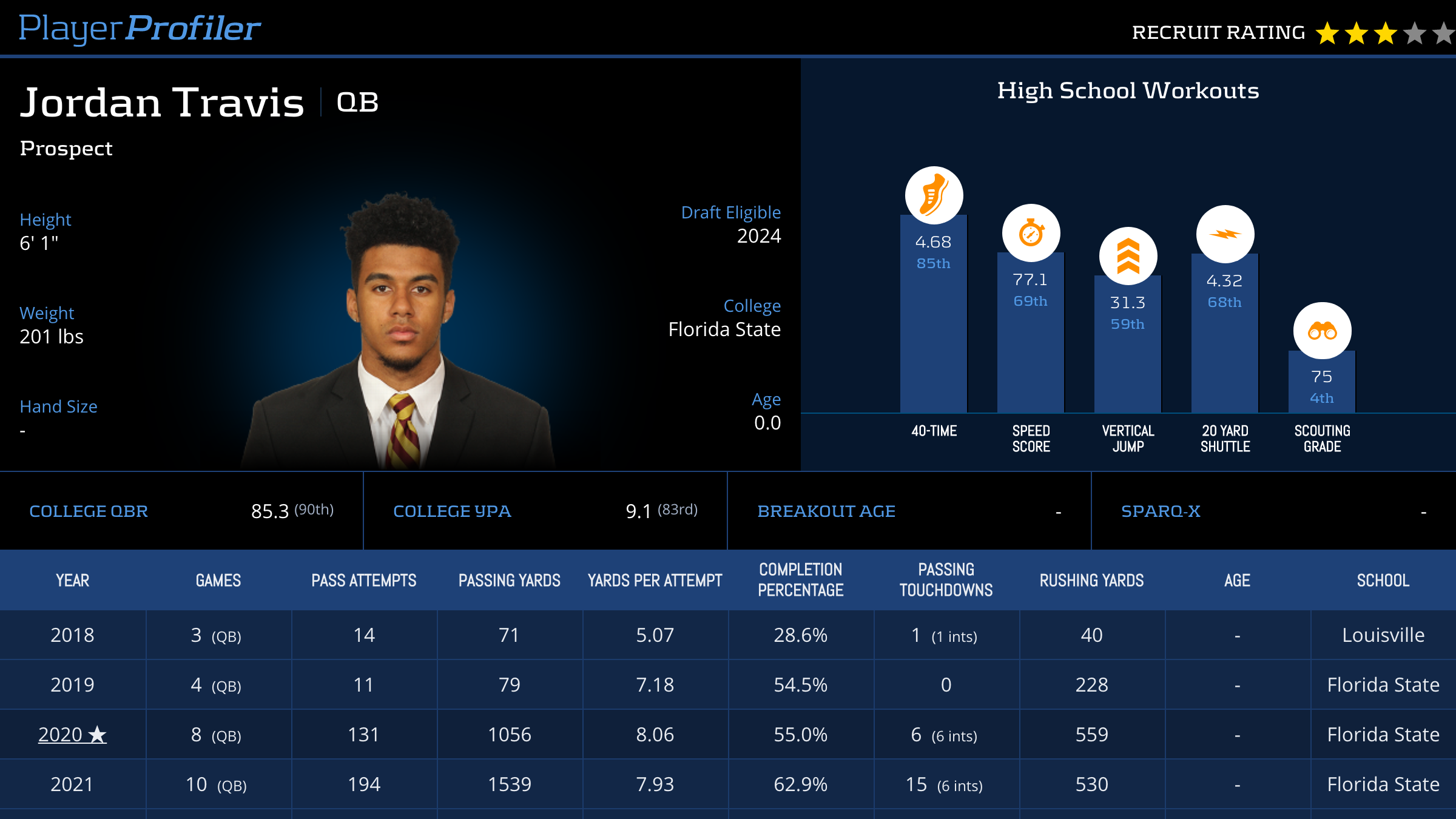 | Year Year | Games Games | Pass Attempts Pass Atts | Passing Yards Pass Yds | Yards Per Attempt YPA | Completion Percentage Comp % | Passing Touchdowns Pass TDs | Rushing Yards Rush Yds | Age Age | School School |