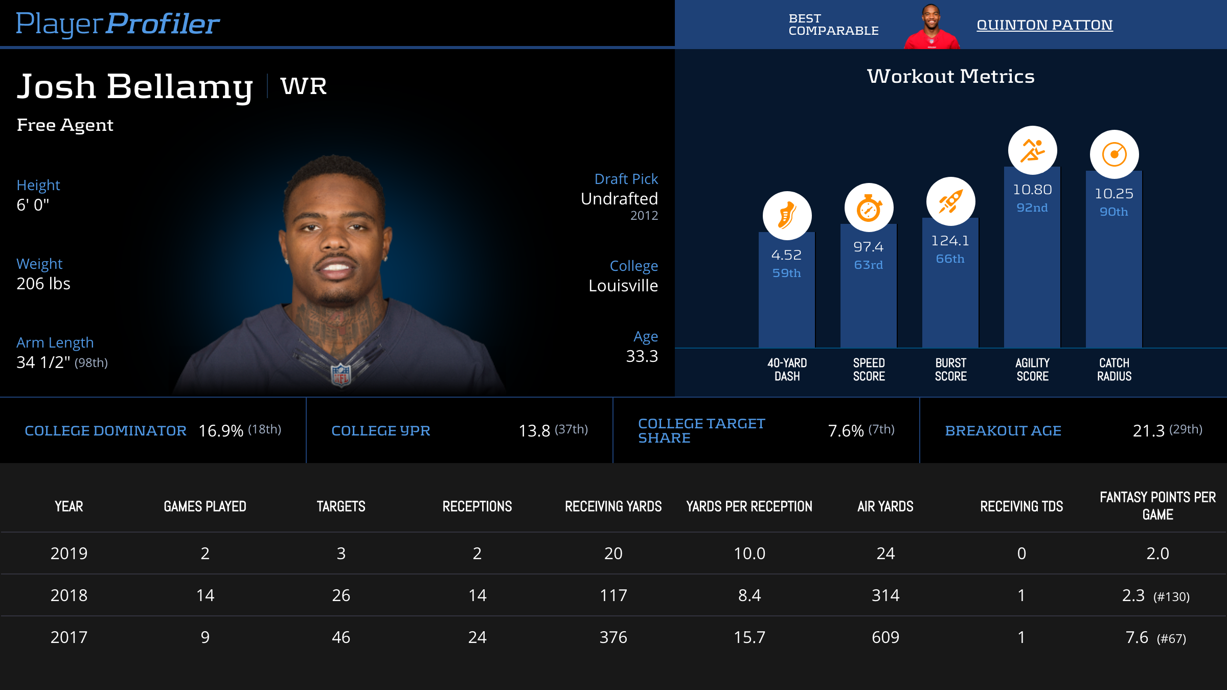 Box score statistics such as targets, yards, touchdowns, and fantasy points per target are updated the next day. Advanced stats and metrics are updated later in the week during the NFL season.