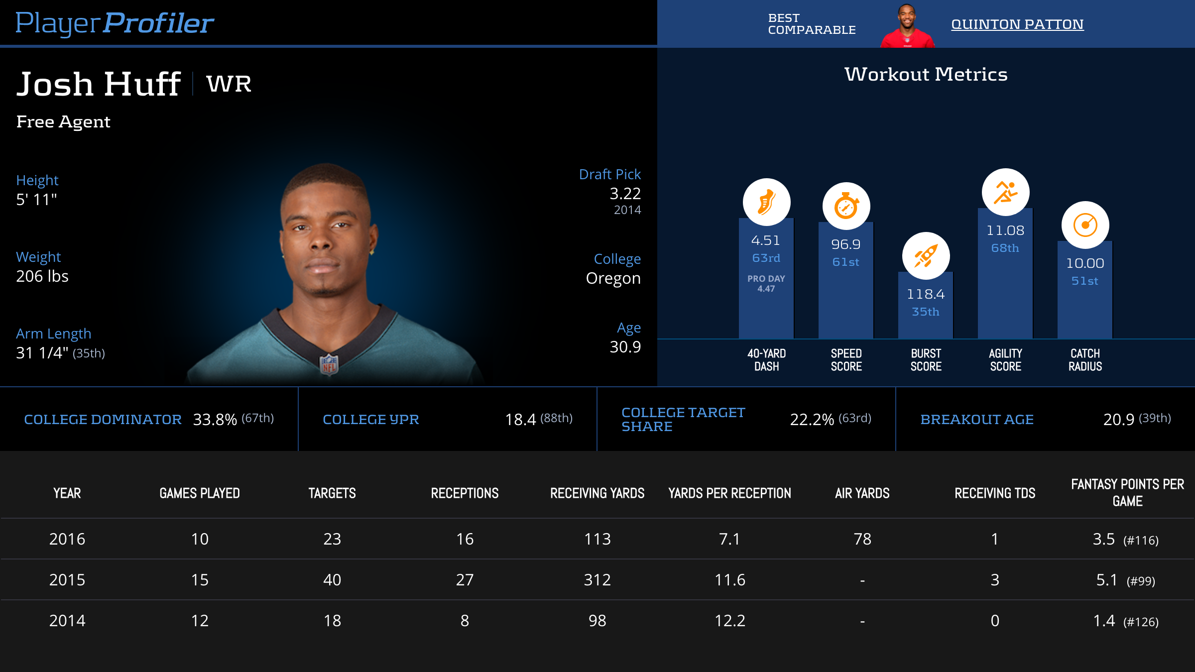 | Year Year | Games Games | Receptions Recs | Receiving Yards Rec Yds | Target Share Tgt Share | Catch Rate Catch Rate | Receiving Touchdowns Rec TDs | Special Teams Yards Special Teams | Age Age | School School |