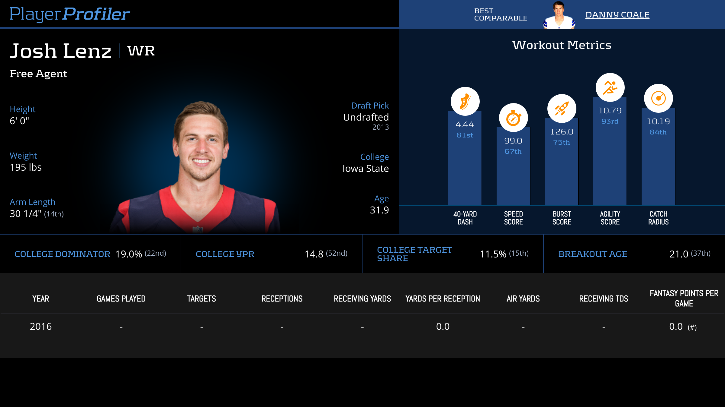 | Year Year | Games Games | Receptions Recs | Receiving Yards Rec Yds | Target Share Tgt Share | Catch Rate Catch Rate | Receiving Touchdowns Rec TDs | Special Teams Yards Special Teams | Age Age | School School |