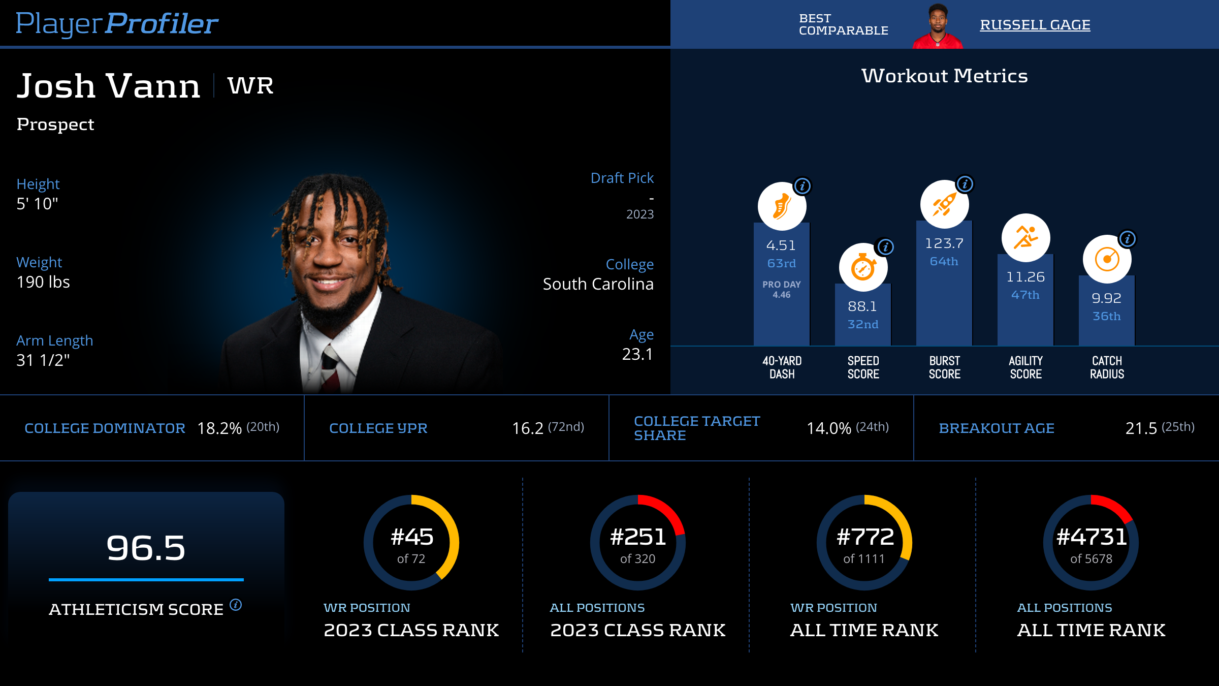 | Year Year | Games Games | Receptions Recs | Receiving Yards Rec Yds | Target Share Tgt Share | Catch Rate Catch Rate | Receiving Touchdowns Rec TDs | Special Teams Yards Special Teams | Age Age | School School |