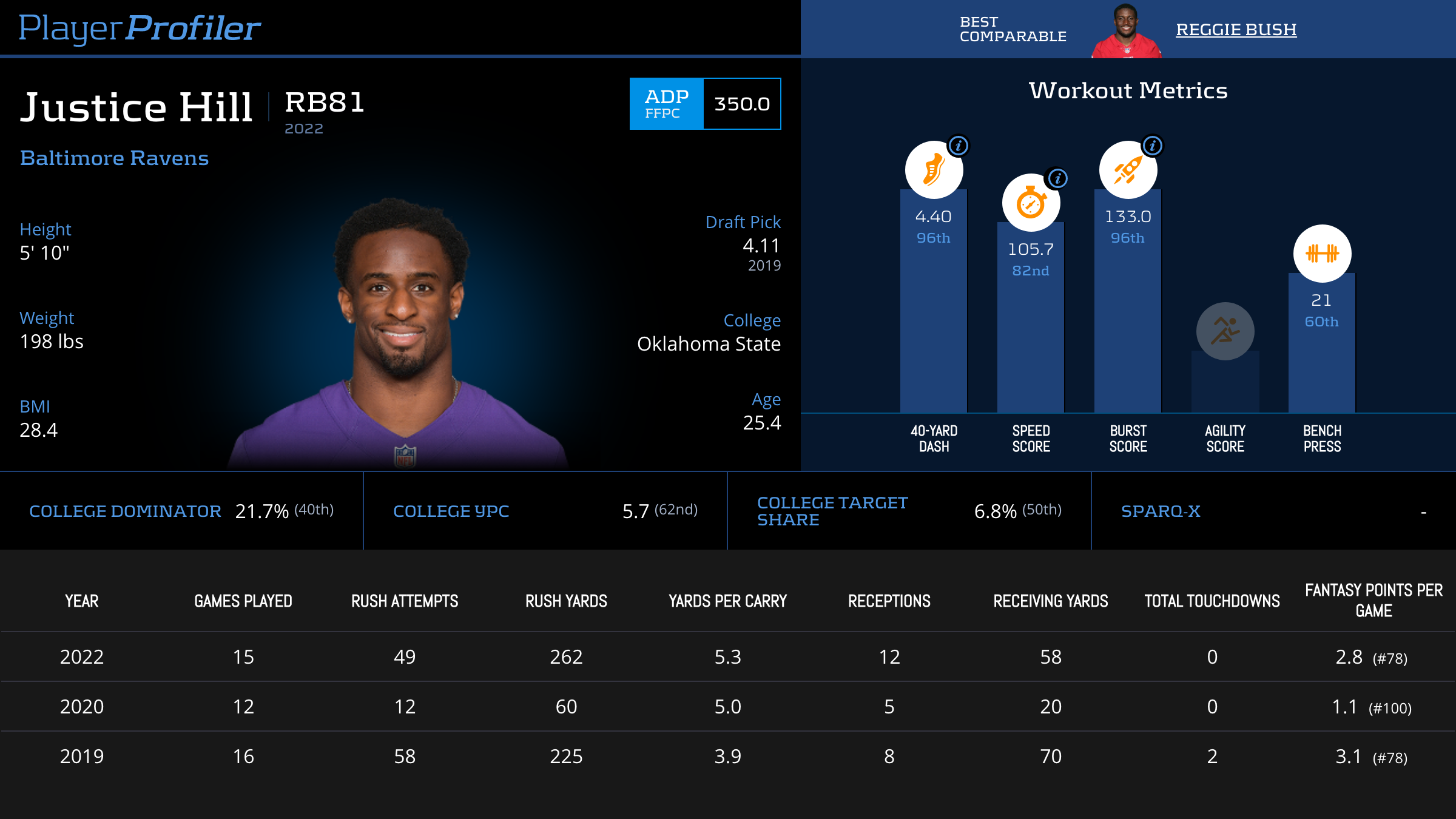 | Year Year | Games Games | Rush Attempts Rush Atts | Rushing Yards Rush Yrds | Total Touchdowns TDs | Receptions Rec | Receiving Yards Rec Yrds | Target Share Tgt Share | Age Age | School School |