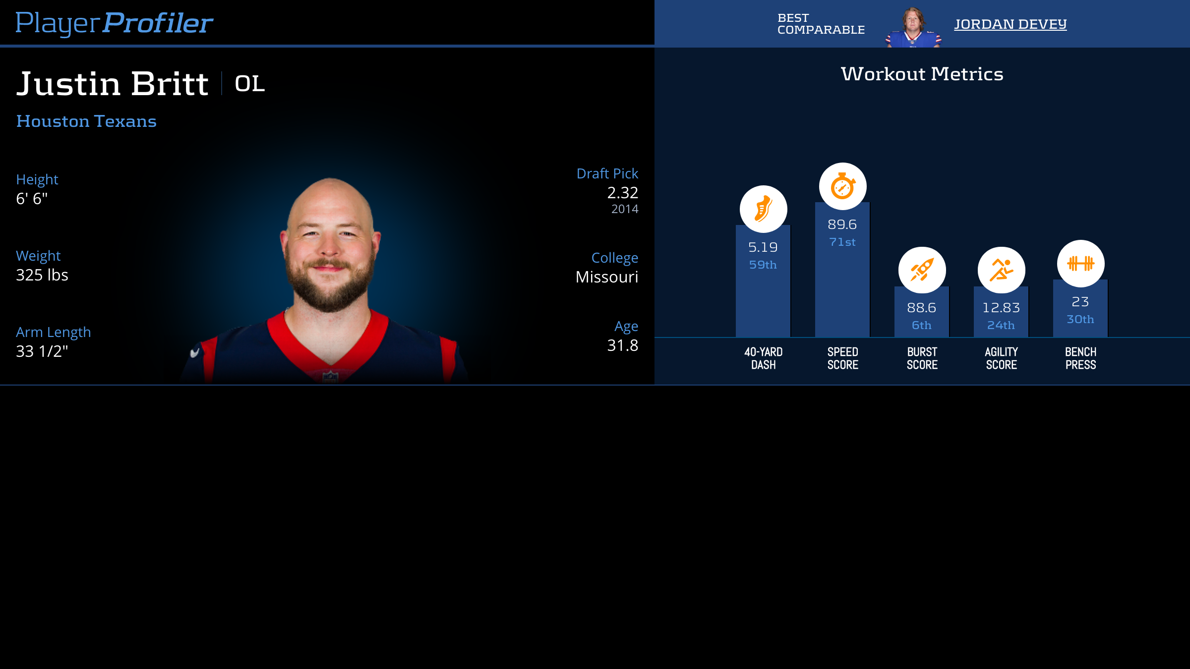 Download all Justin Britt advanced stats and metrics with Data Analysis.