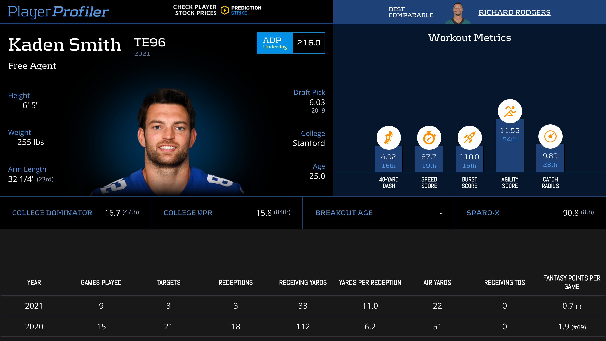 | Year Year | Games Games | Receptions Recs | Receiving Yards Rec Yds | Target Share Tgt Share | Catch Rate Catch Rate | Receiving Touchdowns Rec TDs | Special Teams Yards Special Teams | Age Age | School School |