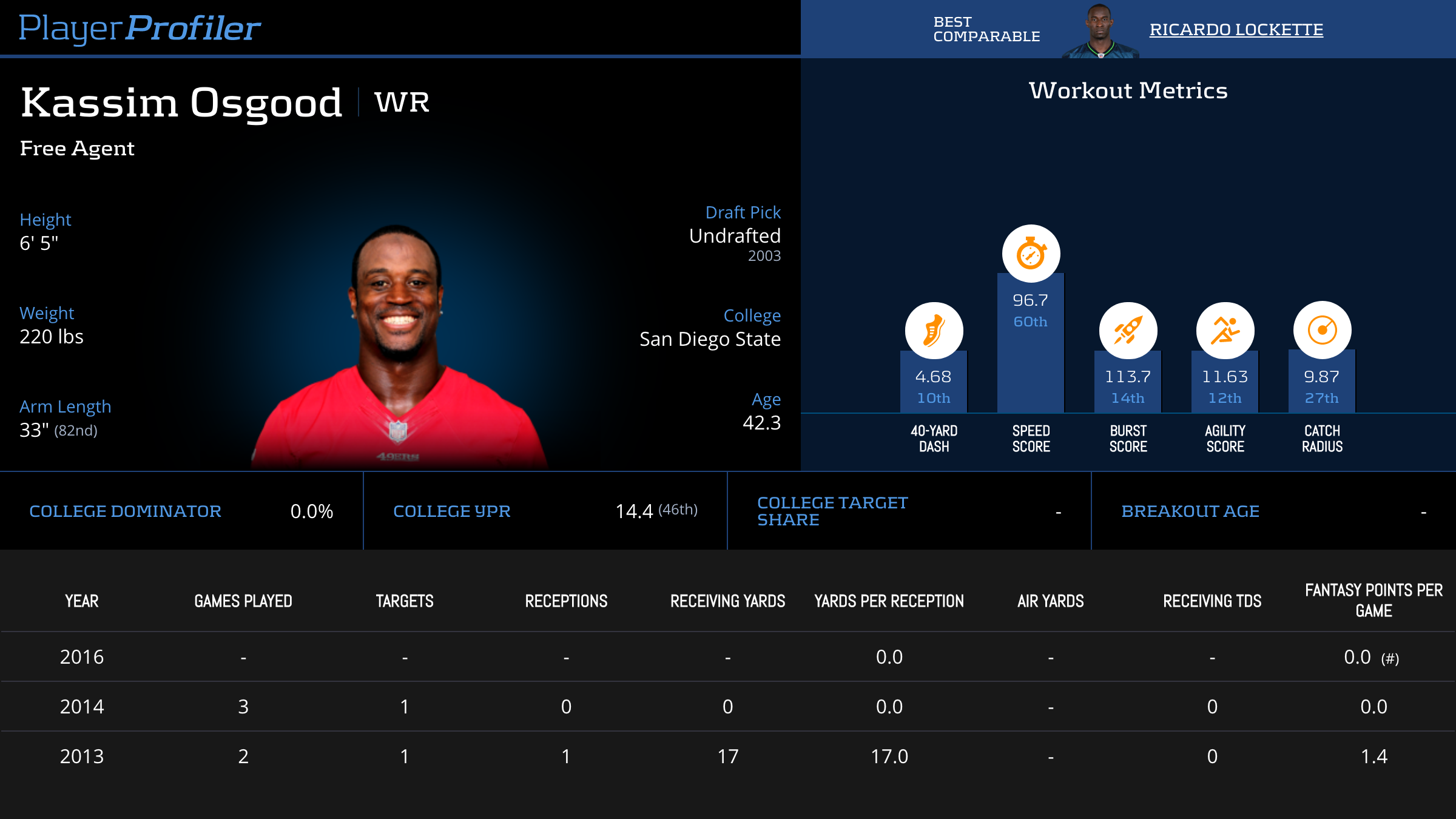 Value Over Stream: Valuation scheme calculates a player's fantasy pts/game over the average waiver wire replacement in standard fantasy league formats during either the current season (or previous year during the offseason) and adjusts for positional bust rates. VOS rank in parenthesis spans all positions, enabling player comparisons across QB's, RB's, WR's, and TE's.