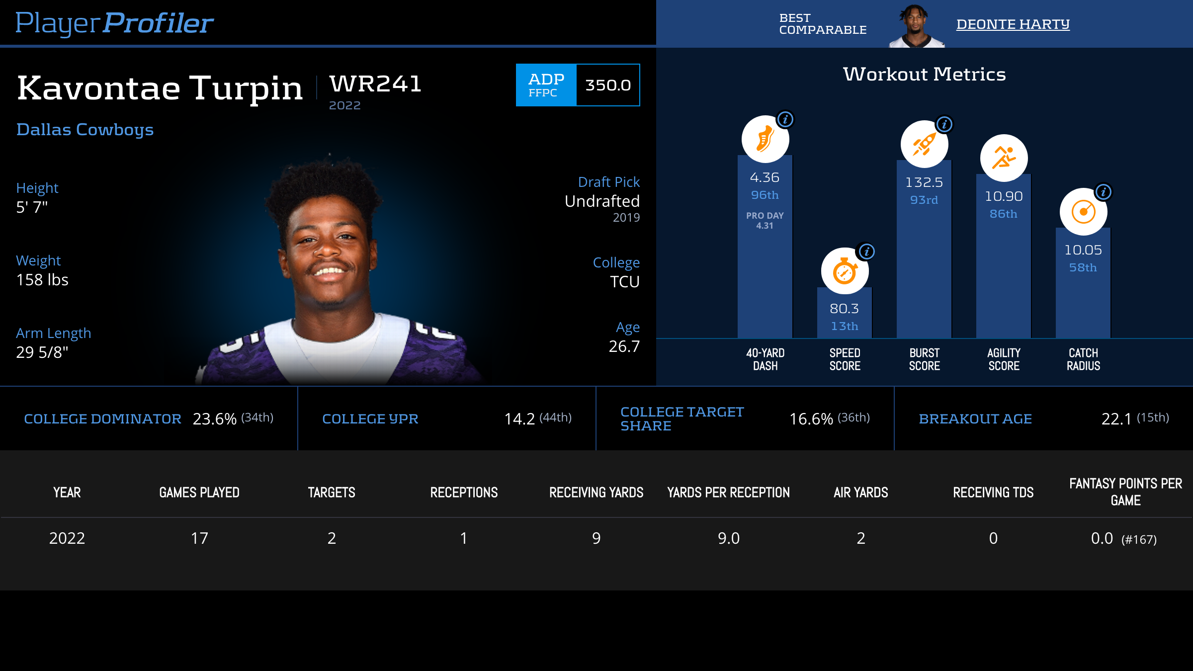 | Year Year | Games Games | Receptions Recs | Receiving Yards Rec Yds | Target Share Tgt Share | Catch Rate Catch Rate | Receiving Touchdowns Rec TDs | Special Teams Yards Special Teams | Age Age | School School |